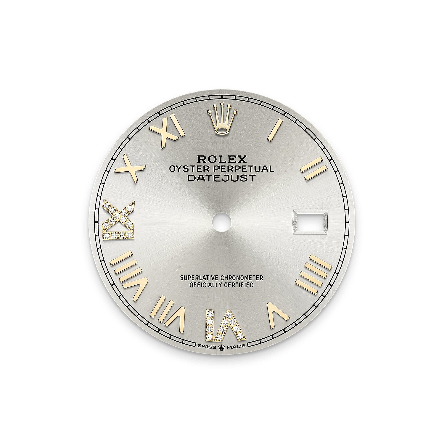 表盘设有镶24颗钻石的18K金罗马数字VI和IX。蚝式系列的许多表盘款式均采用太阳光线效果,折射出淡雅光泽。这种效果需要超卓的刷光技术,打造从表盘中央往外扩展的刻纹。