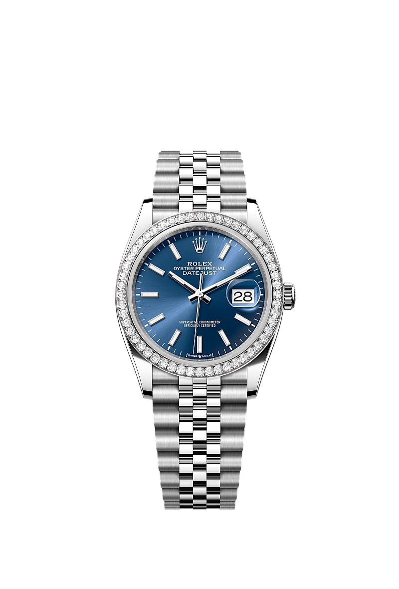蚝式恒动日志型 36腕表白色黄金及蚝式钢款,搭配亮蓝色表盘及纪念型(Jubilee)表带。