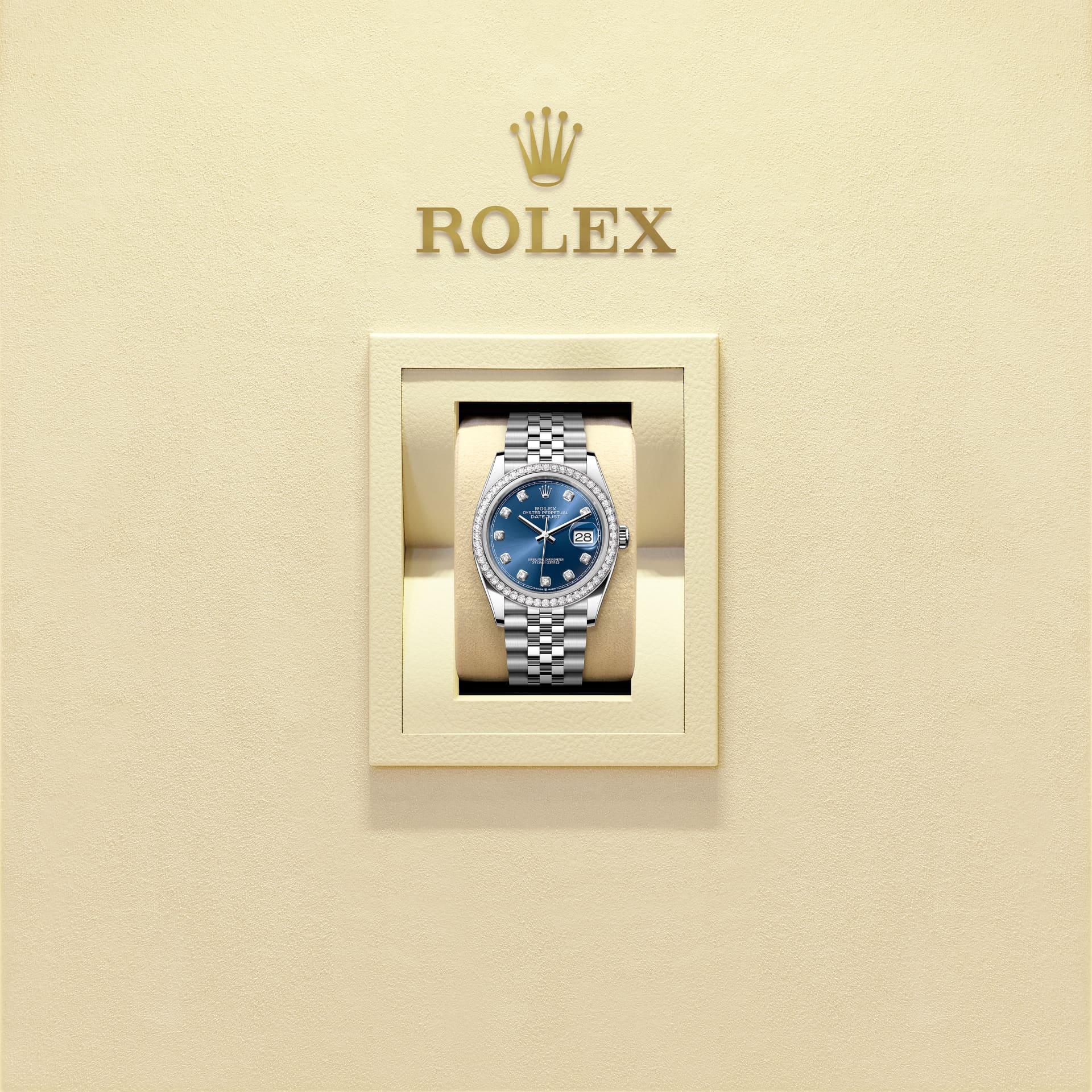 蚝式恒动日志型 36腕表白色黄金及蚝式钢款,搭配镶钻亮蓝色表盘及纪念型(Jubilee)表带。