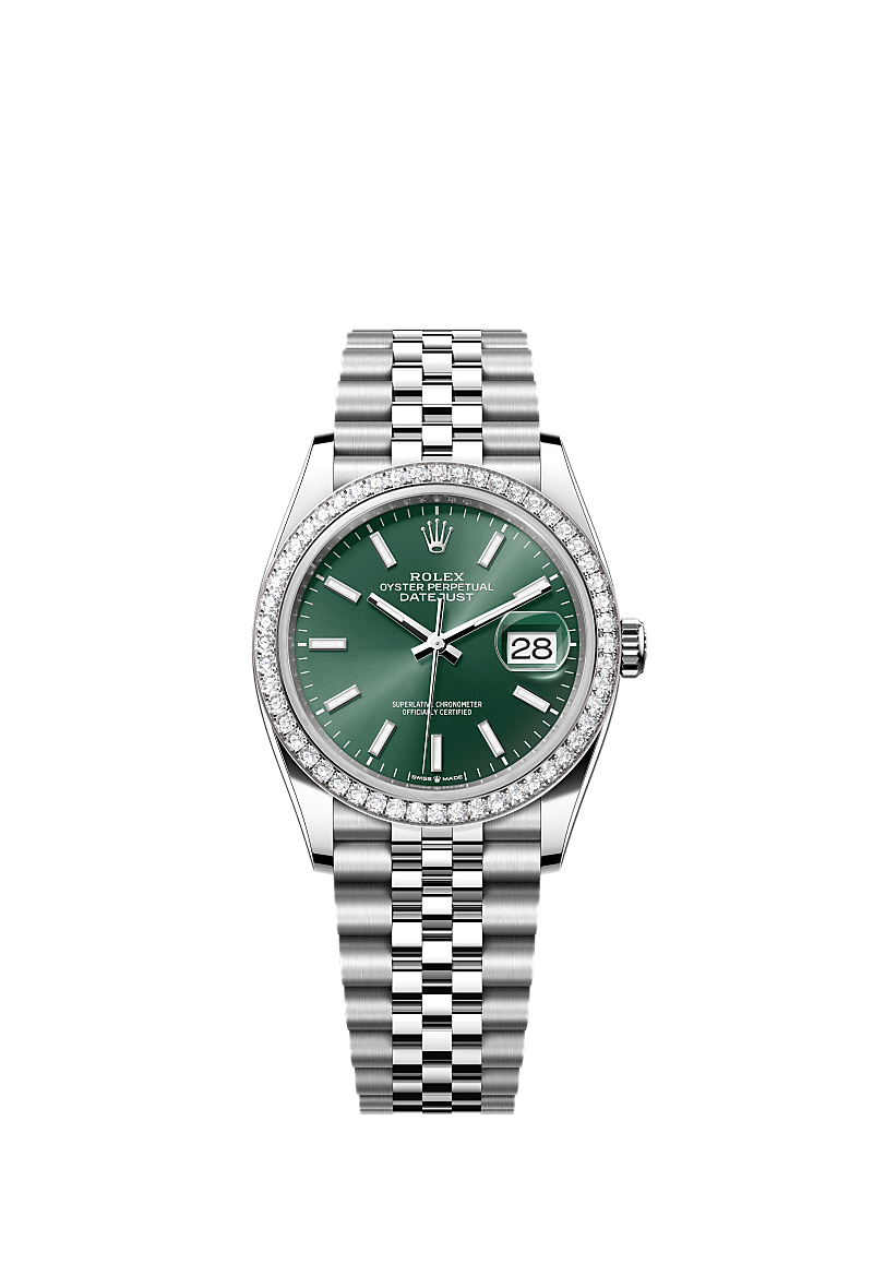 蚝式恒动日志型 36腕表白色黄金及蚝式钢款,搭配薄荷绿色表盘及纪念型(Jubilee)表带。