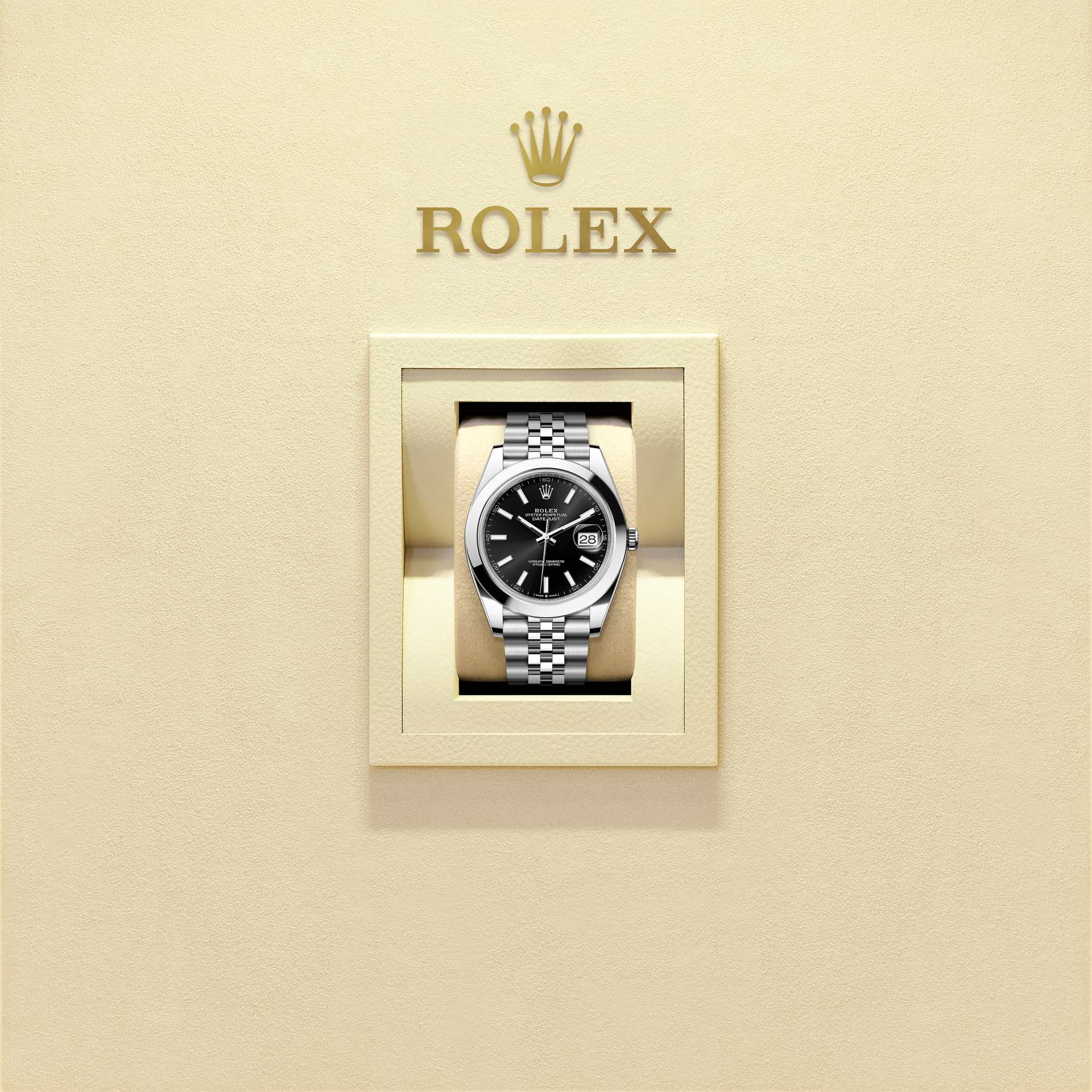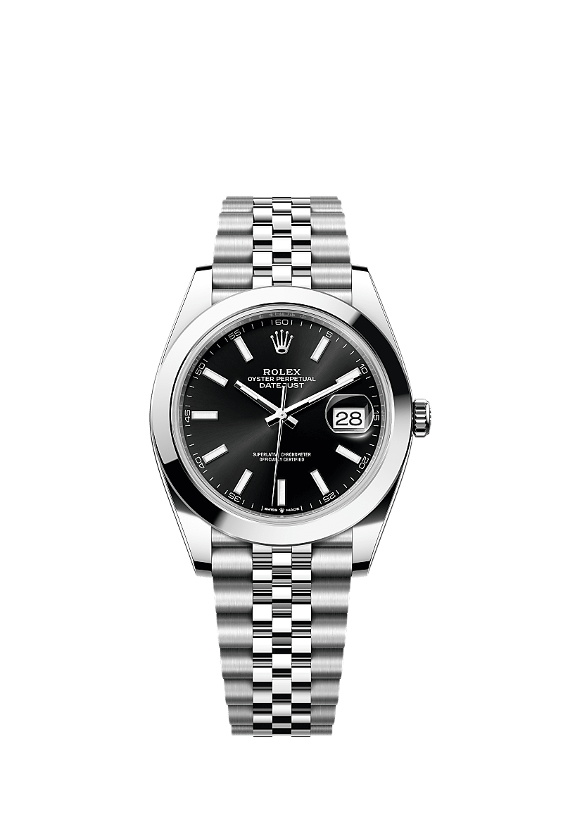 蚝式恒动日志型 41腕表蚝式钢款,搭配亮黑色表盘及纪念型(Jubilee)表带。