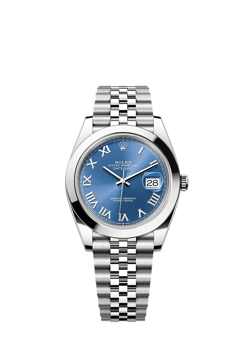 蚝式恒动日志型 41腕表蚝式钢款,搭配天蓝色表盘及纪念型(Jubilee)表带。