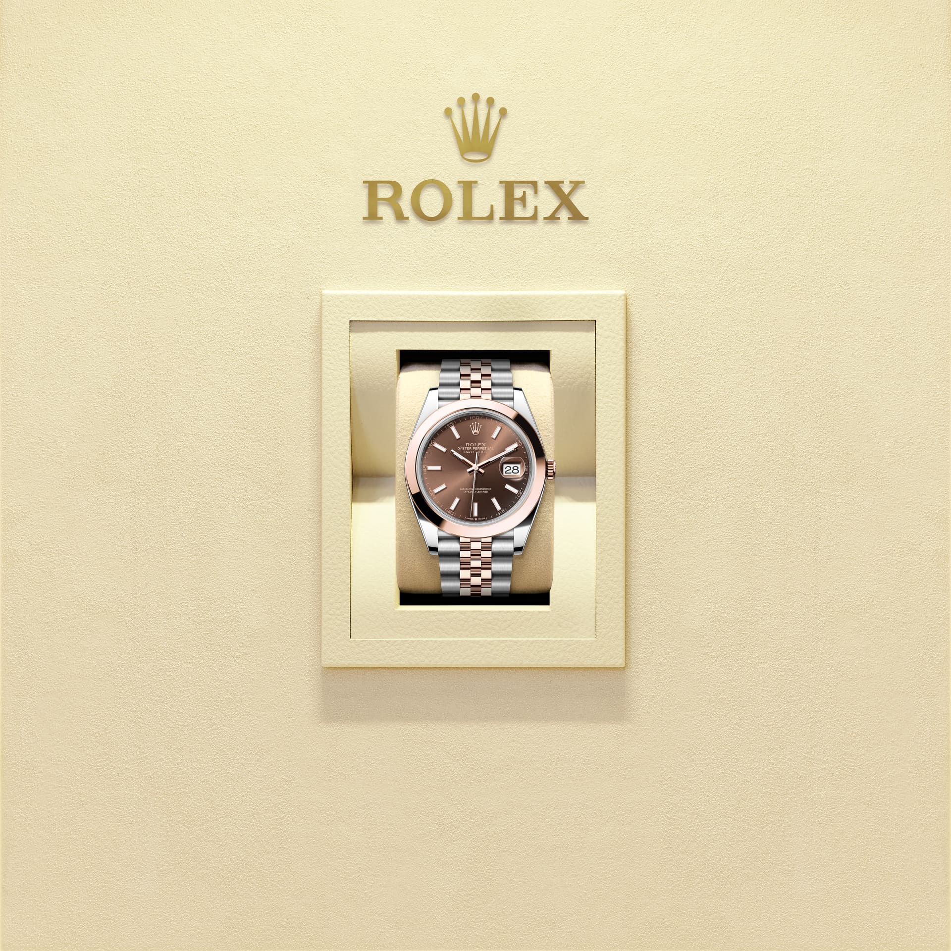 蚝式恒动日志型 41腕表永恒玫瑰金及蚝式钢款,搭配巧克力色表盘及纪念型(Jubilee)表带。