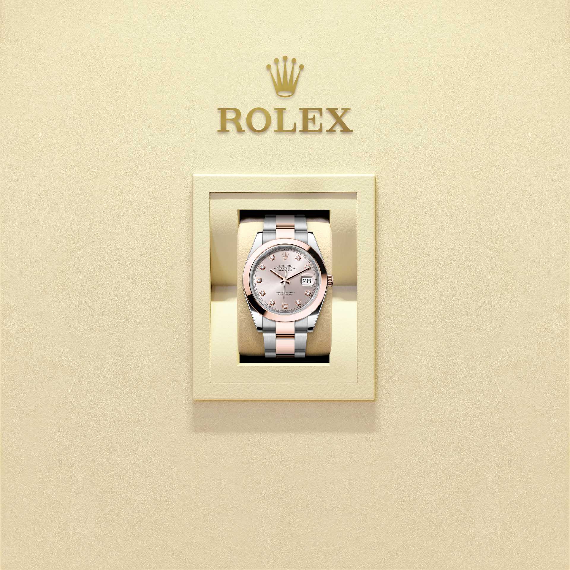 蚝式恒动日志型 41腕表永恒玫瑰金及蚝式钢款,搭配镶钻日亮金色表盘及蚝式(Oyster)表带。