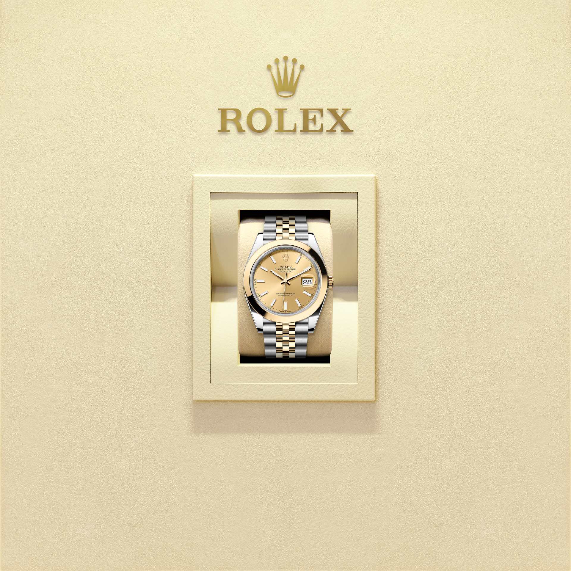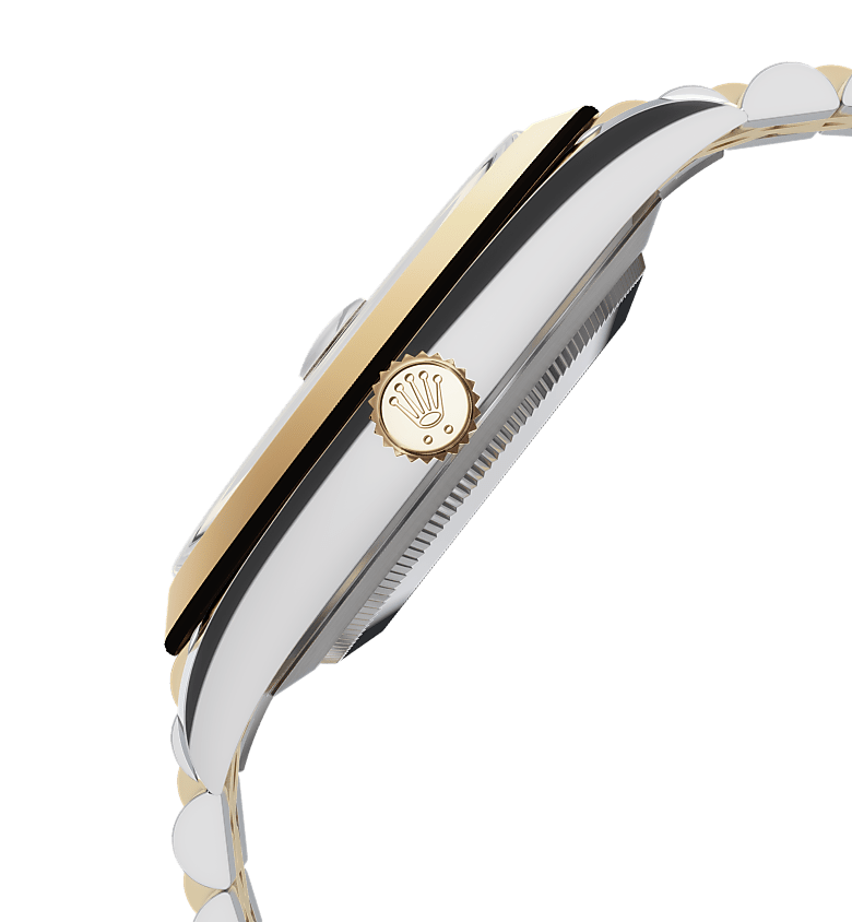 蚝式恒动日志型 41腕表黄金及蚝式钢款,搭配香槟色表盘及纪念型(Jubilee)表带。