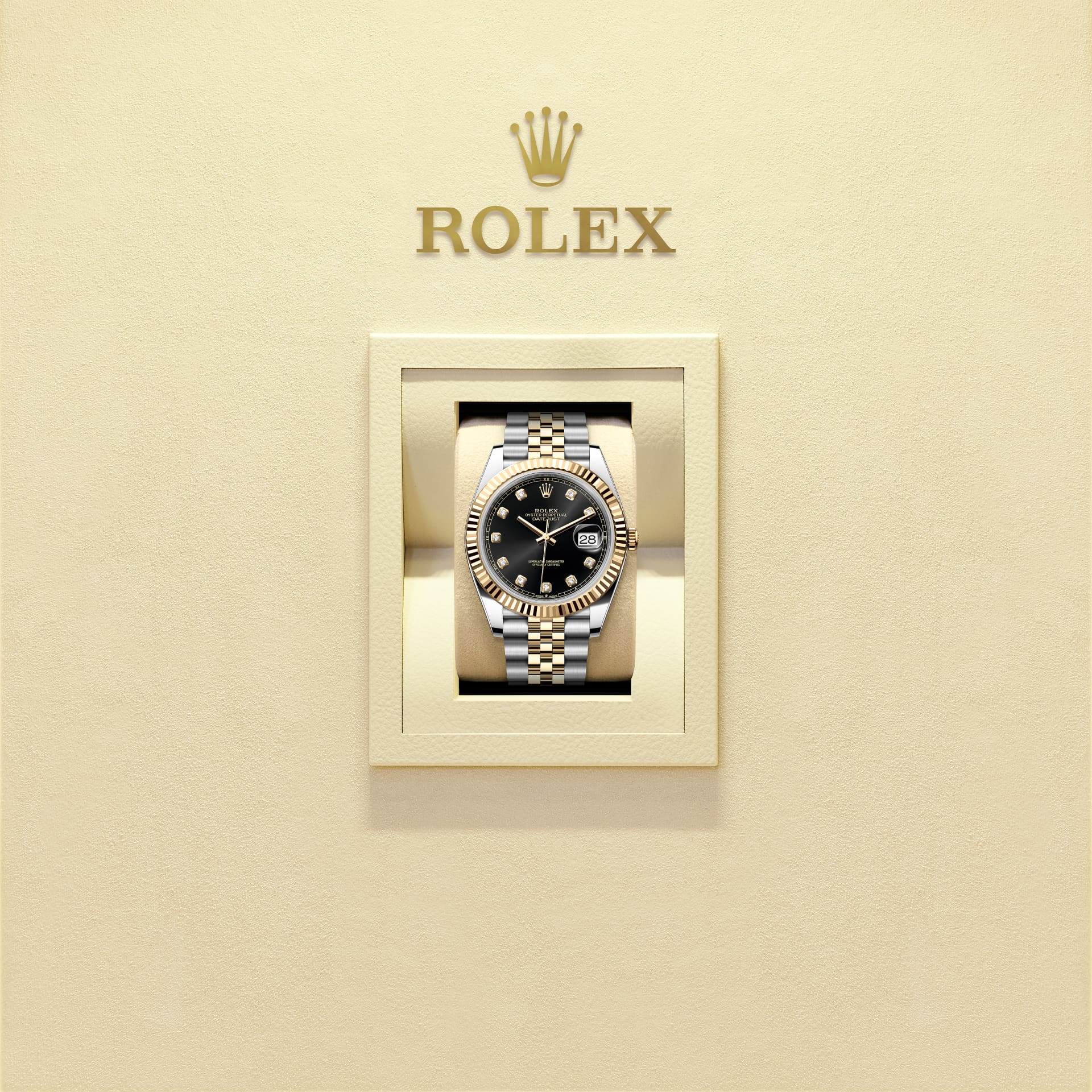 蚝式恒动日志型 41腕表黄金及蚝式钢款,搭配镶钻亮黑色表盘及纪念型(Jubilee)表带。
