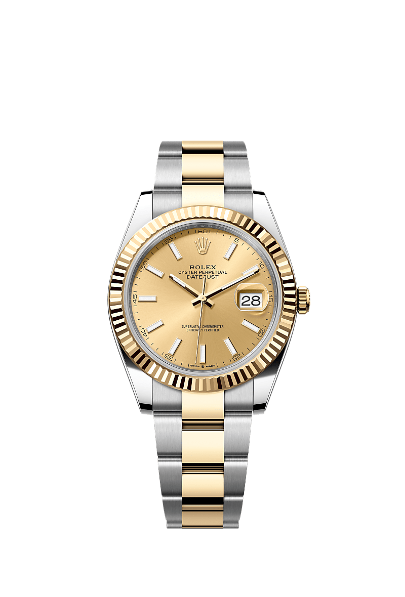 蚝式恒动日志型 41腕表黄金及蚝式钢款,搭配香槟色表盘及蚝式(Oyster)表带。
