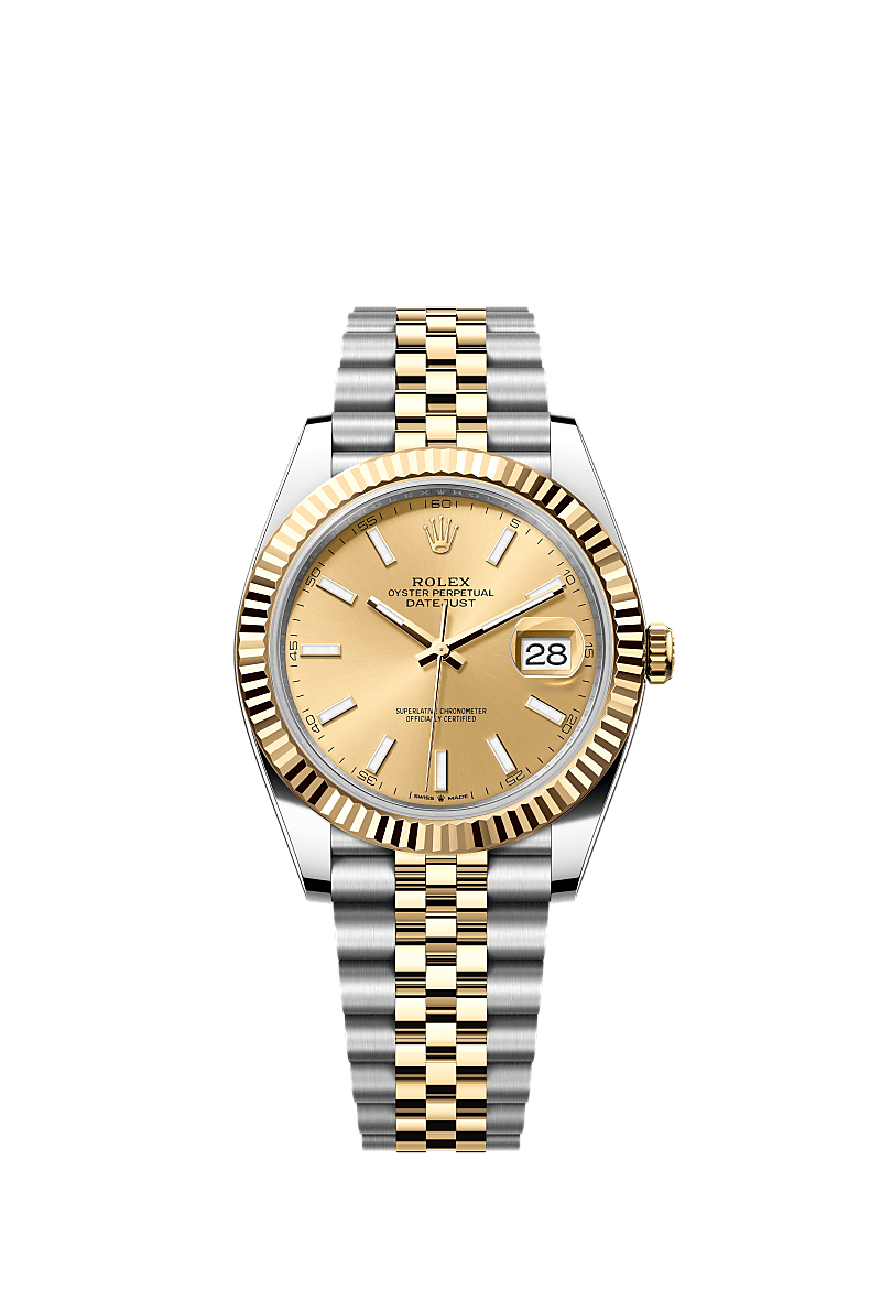 蚝式恒动日志型 41腕表黄金及蚝式钢款,搭配香槟色表盘及纪念型(Jubilee)表带。