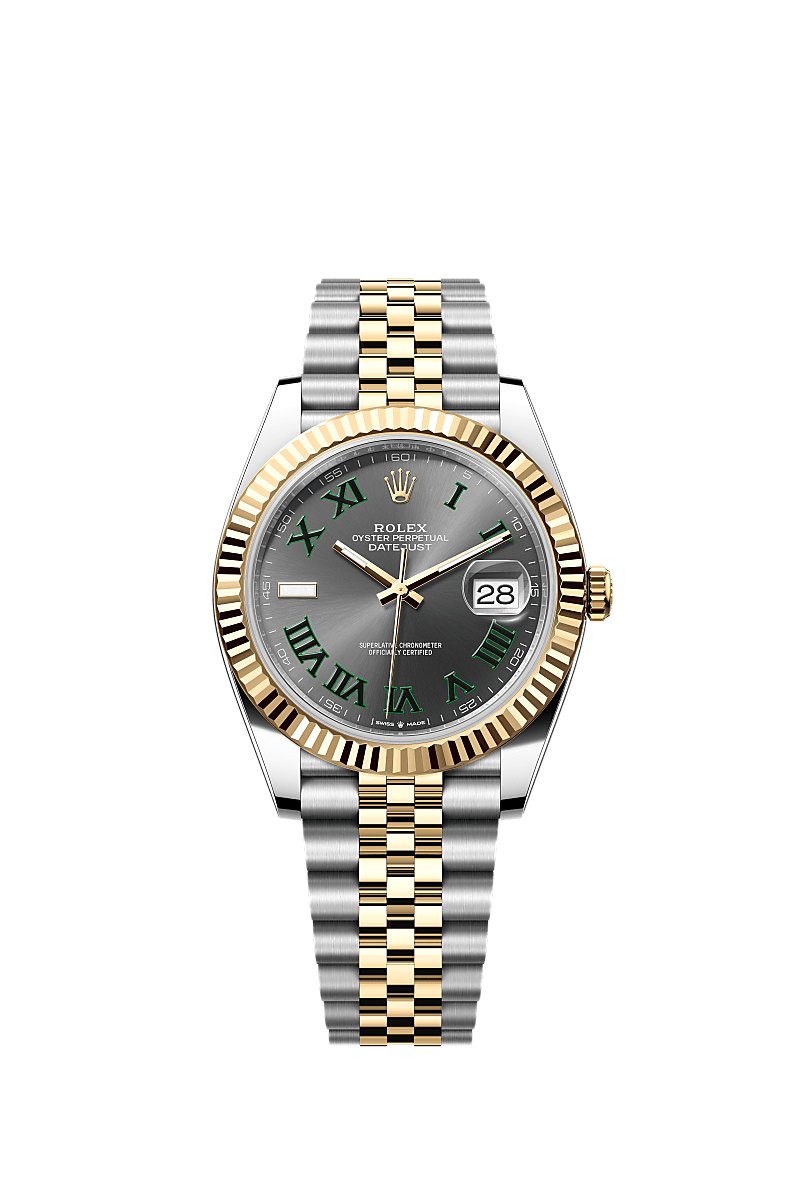 蚝式恒动日志型 41腕表黄金及蚝式钢款,搭配石板灰色表盘及纪念型(Jubilee)表带。
