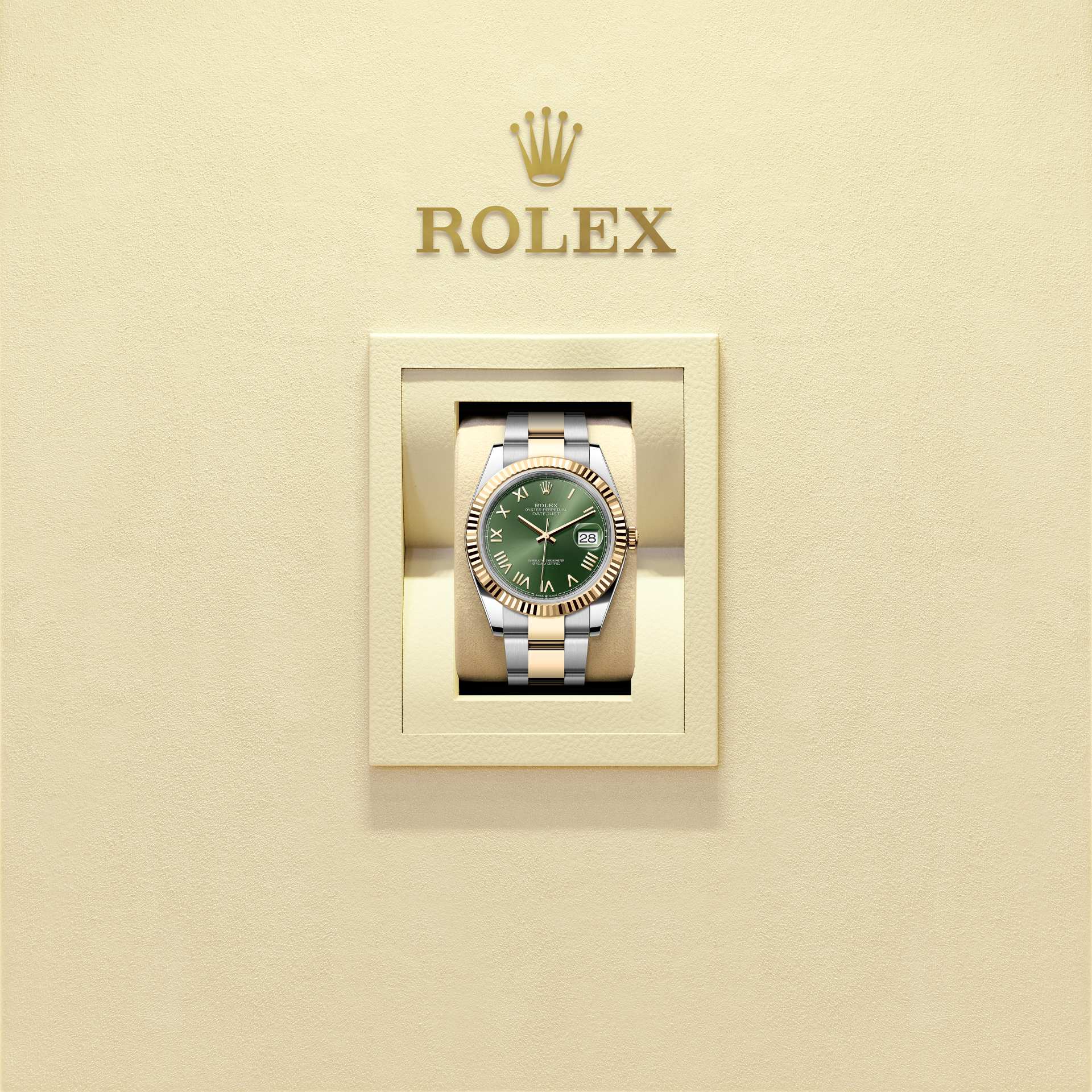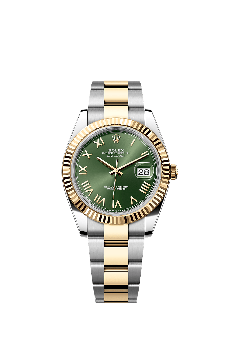 蚝式恒动日志型 41腕表黄金及蚝式钢款,搭配橄榄绿色表盘及蚝式(Oyster)表带。