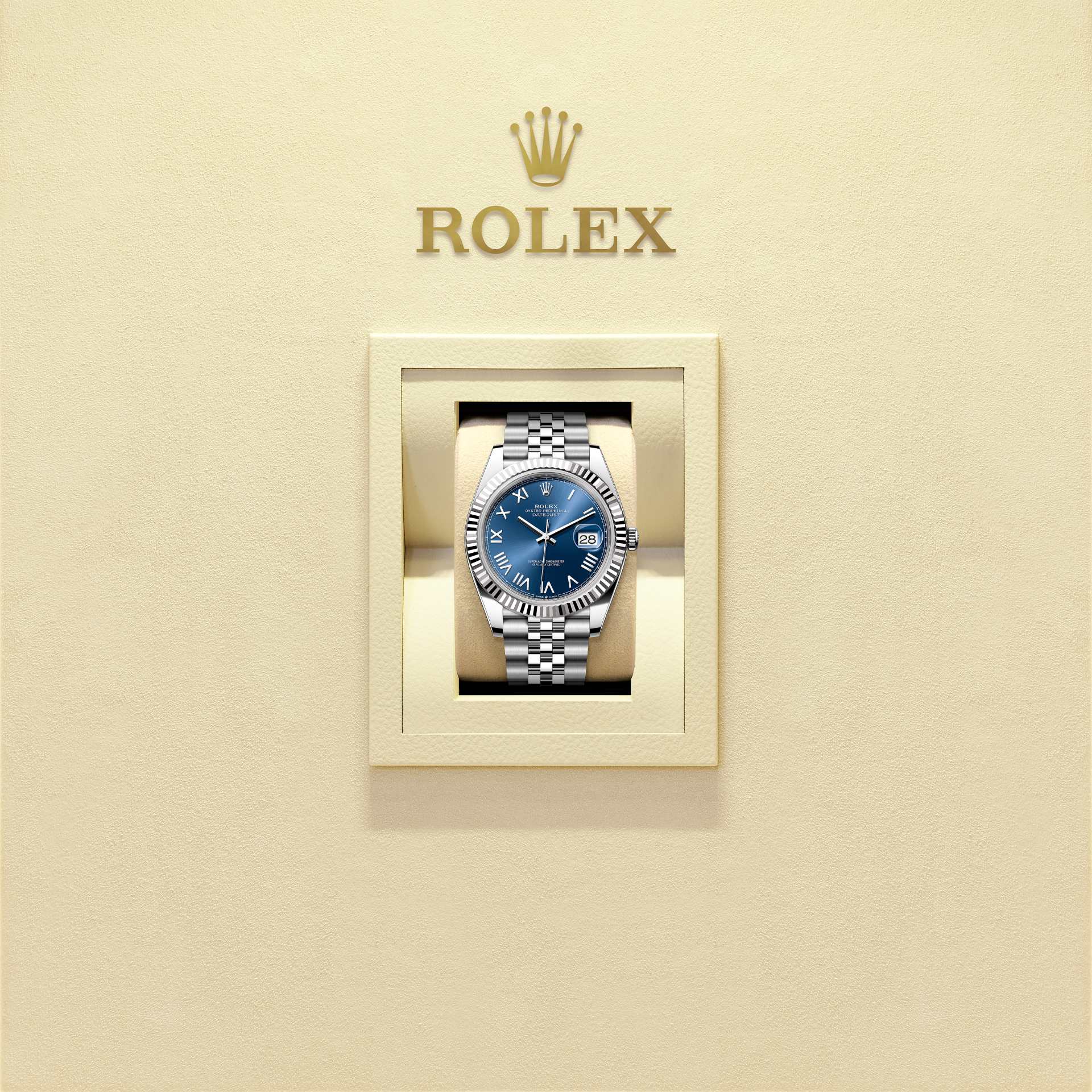 蚝式恒动日志型 41腕表白色黄金及蚝式钢款,搭配亮蓝色表盘及纪念型(Jubilee)表带。