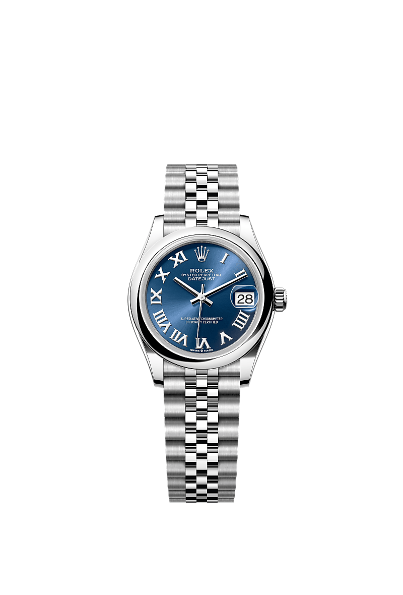 蚝式恒动日志型 31腕表蚝式钢款,搭配亮蓝色表盘及纪念型(Jubilee)表带。