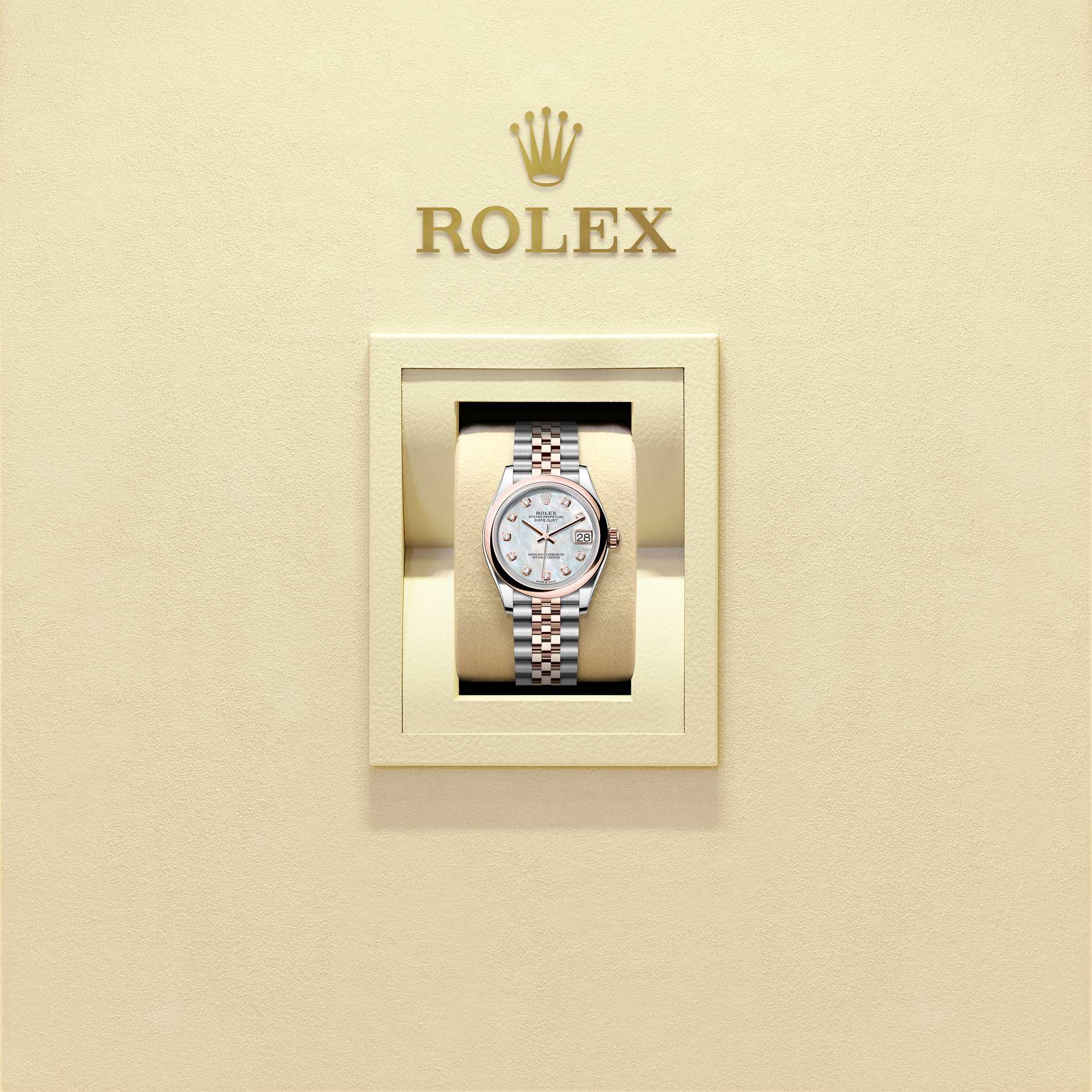 蚝式恒动日志型 31腕表永恒玫瑰金及蚝式钢款,搭配镶钻白色珍珠母表盘及纪念型(Jubilee)表带。