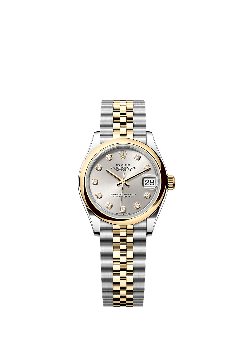 蚝式恒动日志型 31腕表黄金及蚝式钢款,搭配镶钻银色表盘及纪念型(Jubilee)表带。