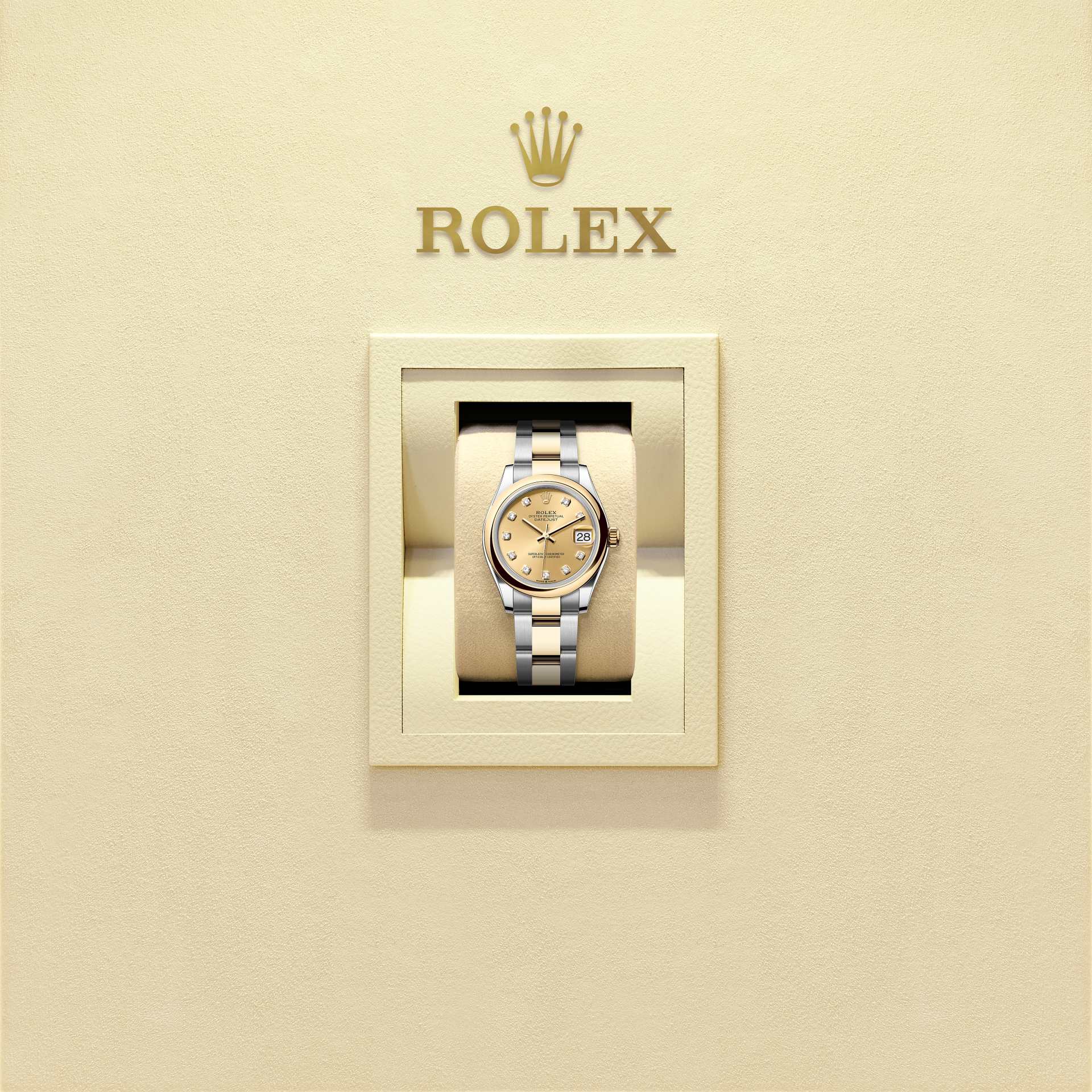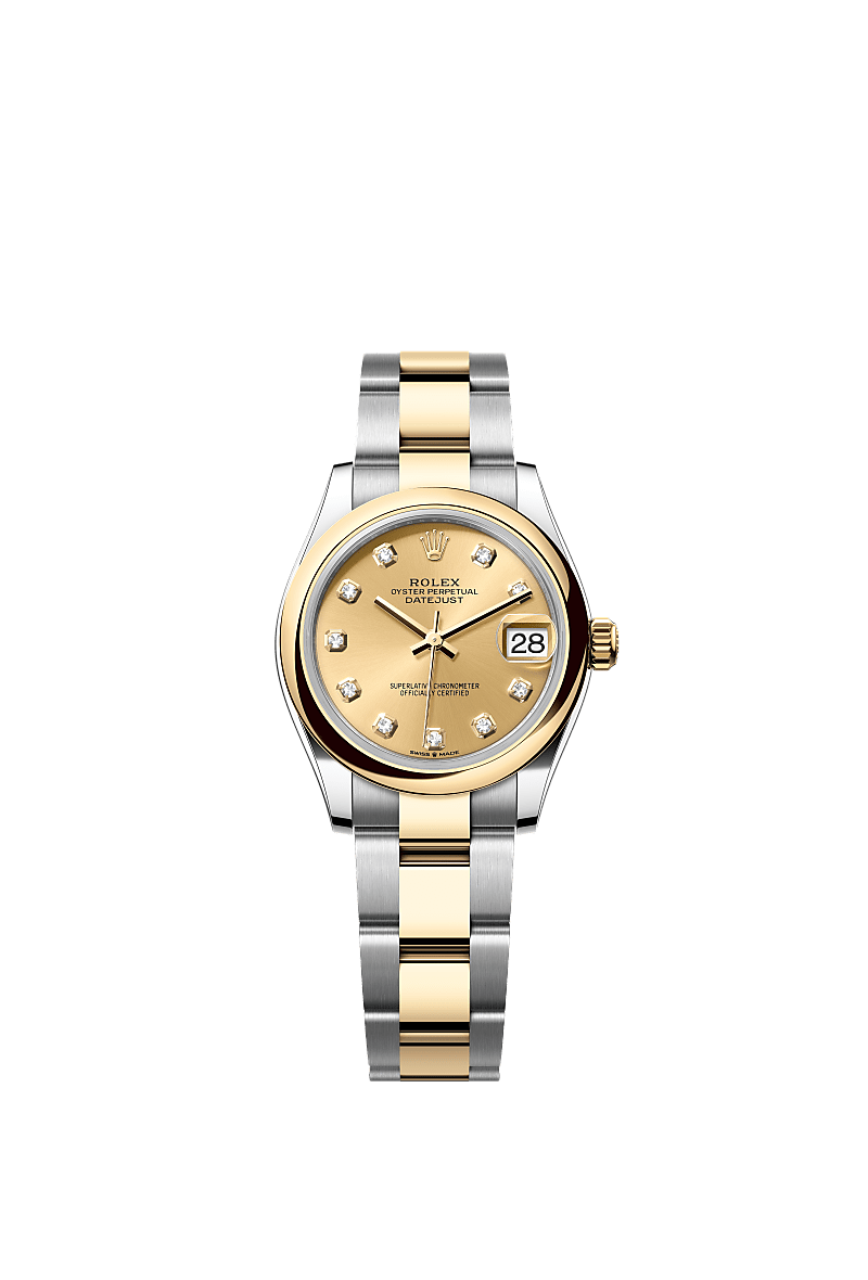 蚝式恒动日志型 31腕表黄金及蚝式钢款,搭配镶钻香槟色表盘及蚝式(Oyster)表带。
