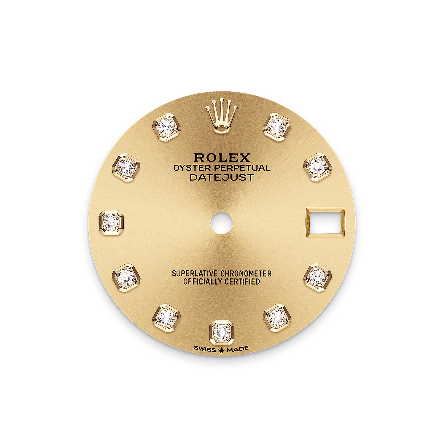 表盘设有18K金底座镶托钻石。蚝式系列的许多表盘款式均采用太阳光线效果,折射出淡雅光泽。这种效果需要超卓的刷光技术,打造从表盘中央往外扩展的刻纹。