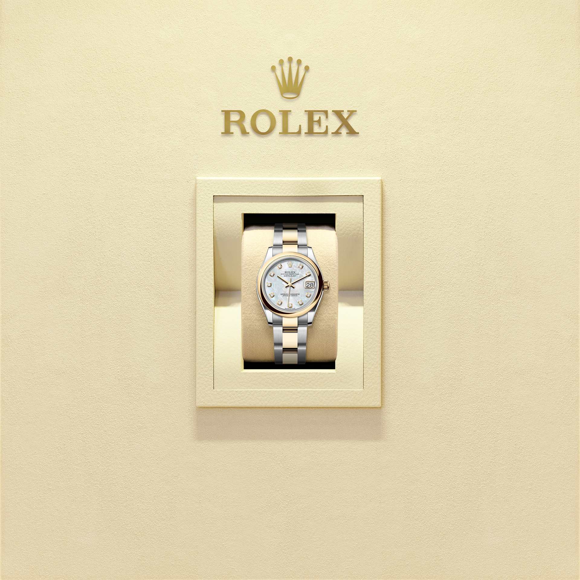 蚝式恒动日志型 31腕表黄金及蚝式钢款,搭配镶钻白色珍珠母表盘及蚝式(Oyster)表带。