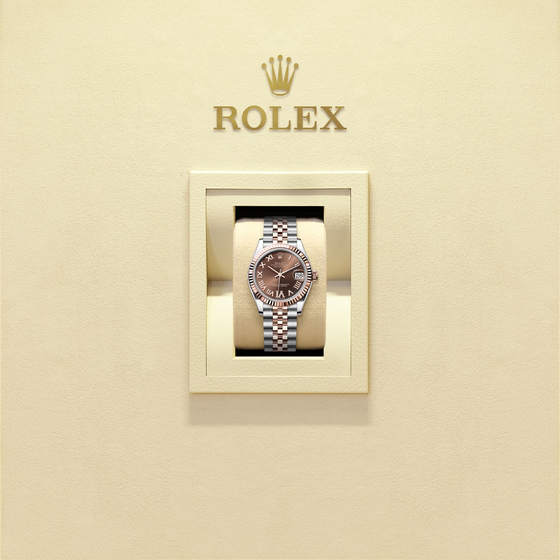 蚝式恒动日志型 31腕表永恒玫瑰金及蚝式钢款,搭配镶钻巧克力色表盘及纪念型(Jubilee)表带。