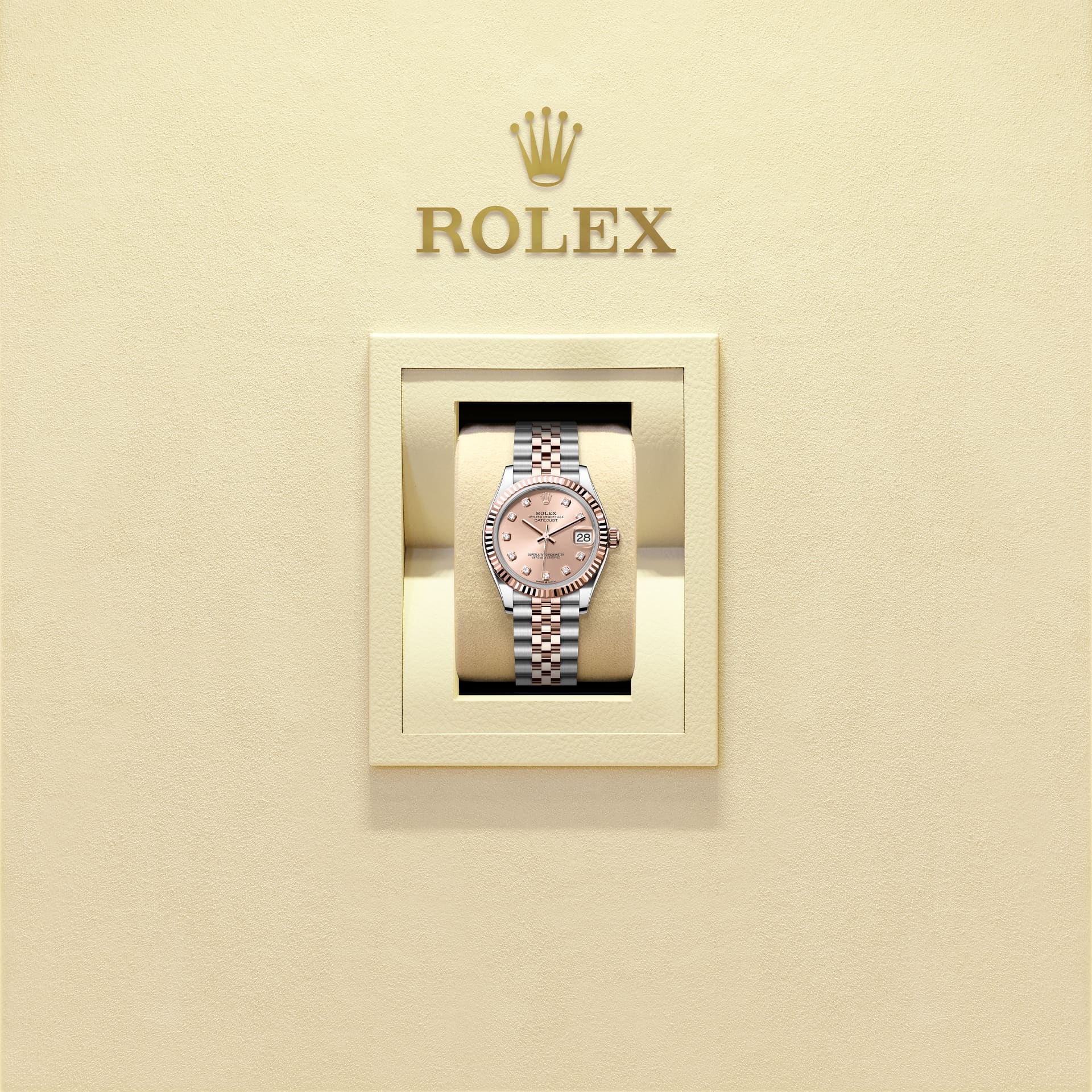 蚝式恒动日志型 31腕表永恒玫瑰金及蚝式钢款,搭配镶钻玫瑰金色表盘及纪念型(Jubilee)表带。