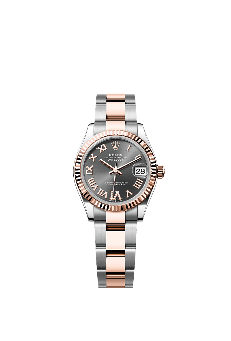 蚝式恒动日志型 31腕表永恒玫瑰金及蚝式钢款,搭配镶钻石板灰色表盘及蚝式(Oyster)表带。