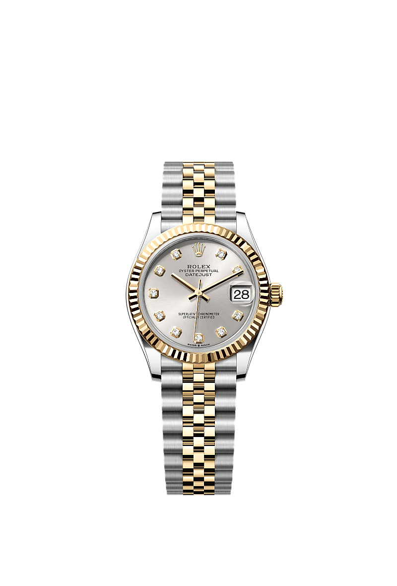 蚝式恒动日志型 31腕表黄金及蚝式钢款,搭配镶钻银色表盘及纪念型(Jubilee)表带。