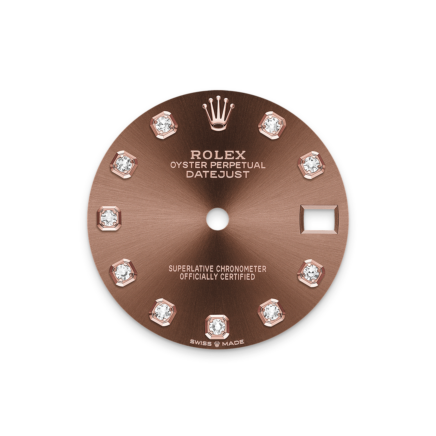 表盘设有18K金底座镶托钻石。蚝式系列的许多表盘款式均采用太阳光线效果,折射出淡雅光泽。这种效果需要超卓的刷光技术,打造从表盘中央往外扩展的刻纹。
