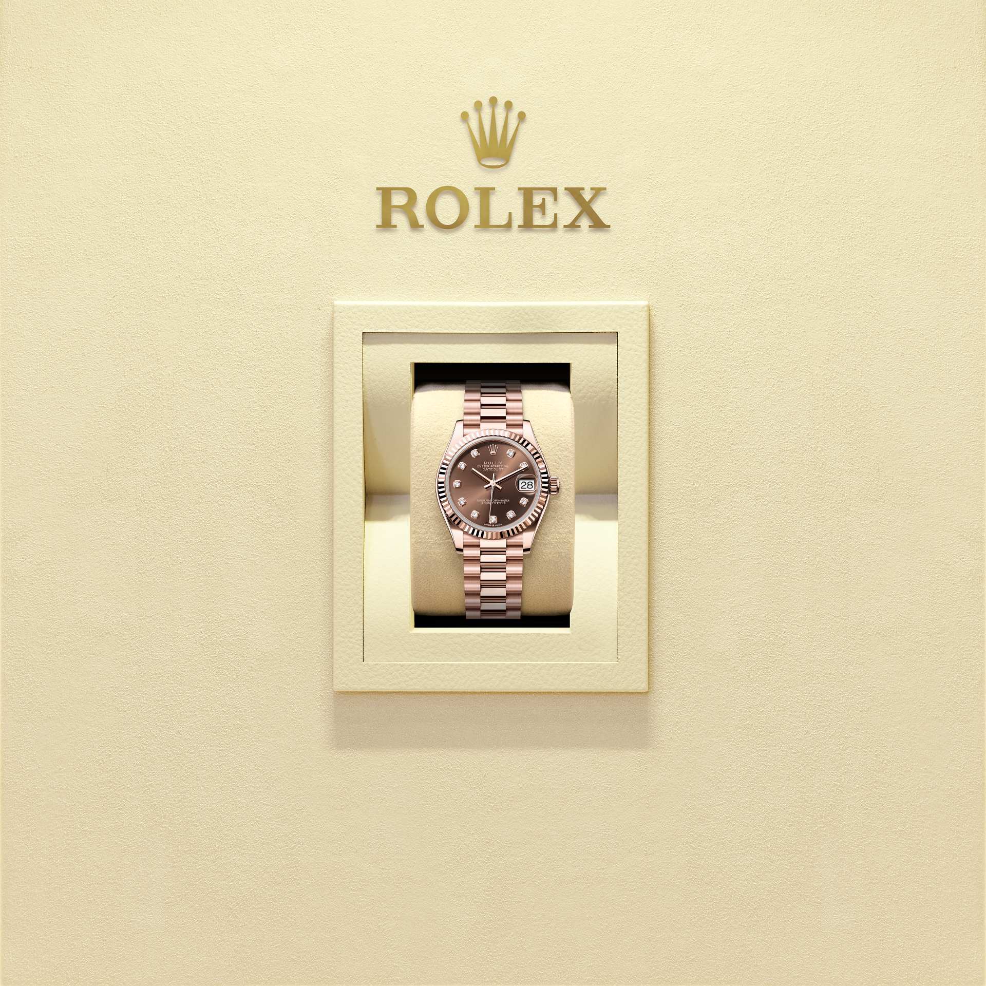 蚝式恒动日志型 31腕表18K永恒玫瑰金款,搭配镶钻巧克力色表盘及元首型(President)表带。