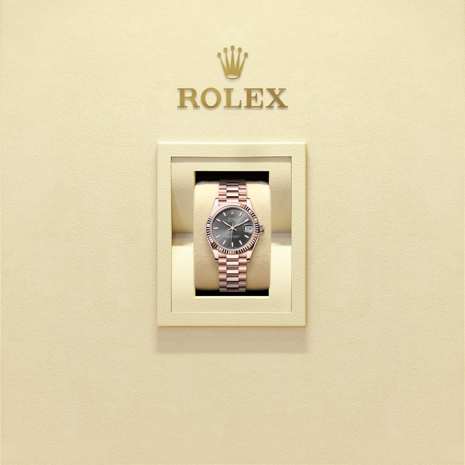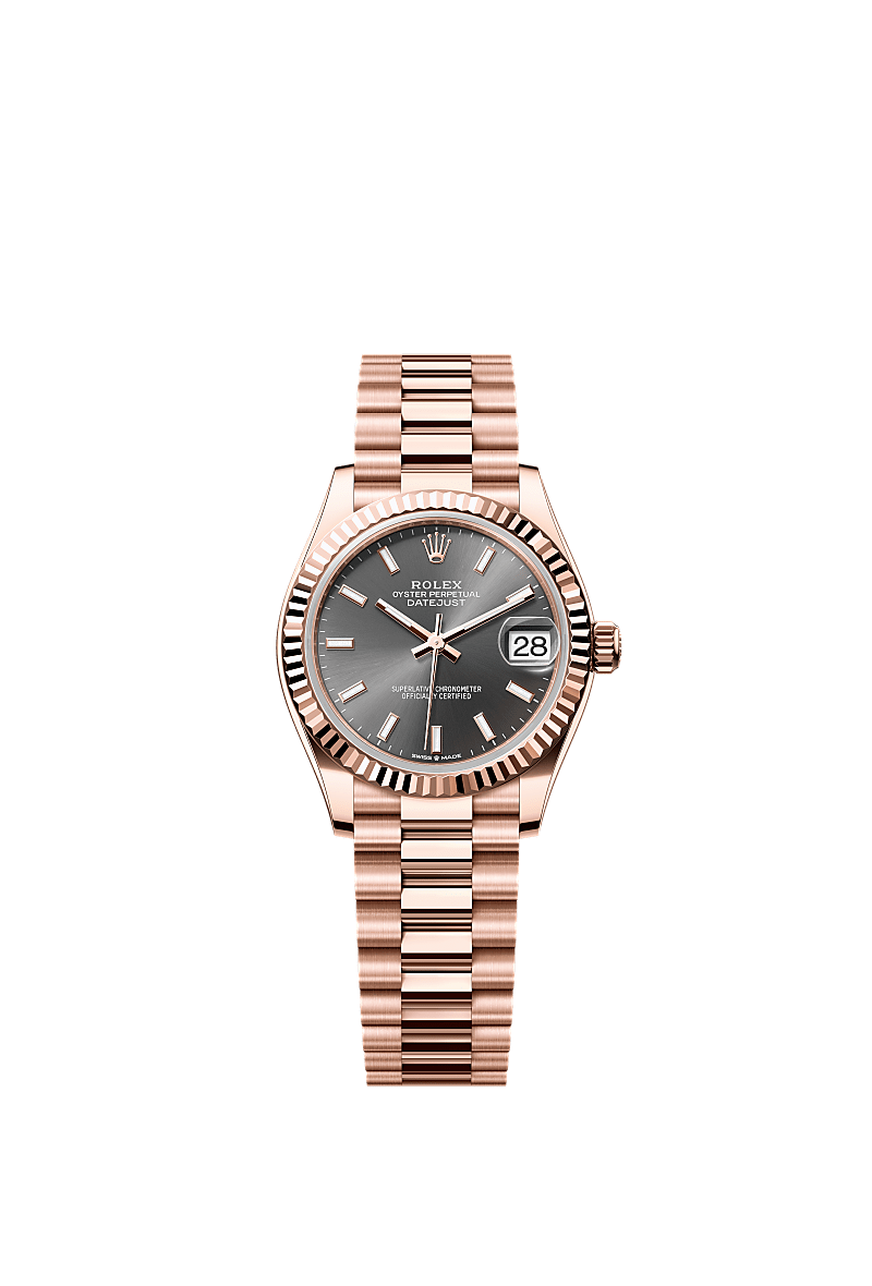 蚝式恒动日志型 31腕表18K永恒玫瑰金款,搭配石板灰色表盘及元首型(President)表带。