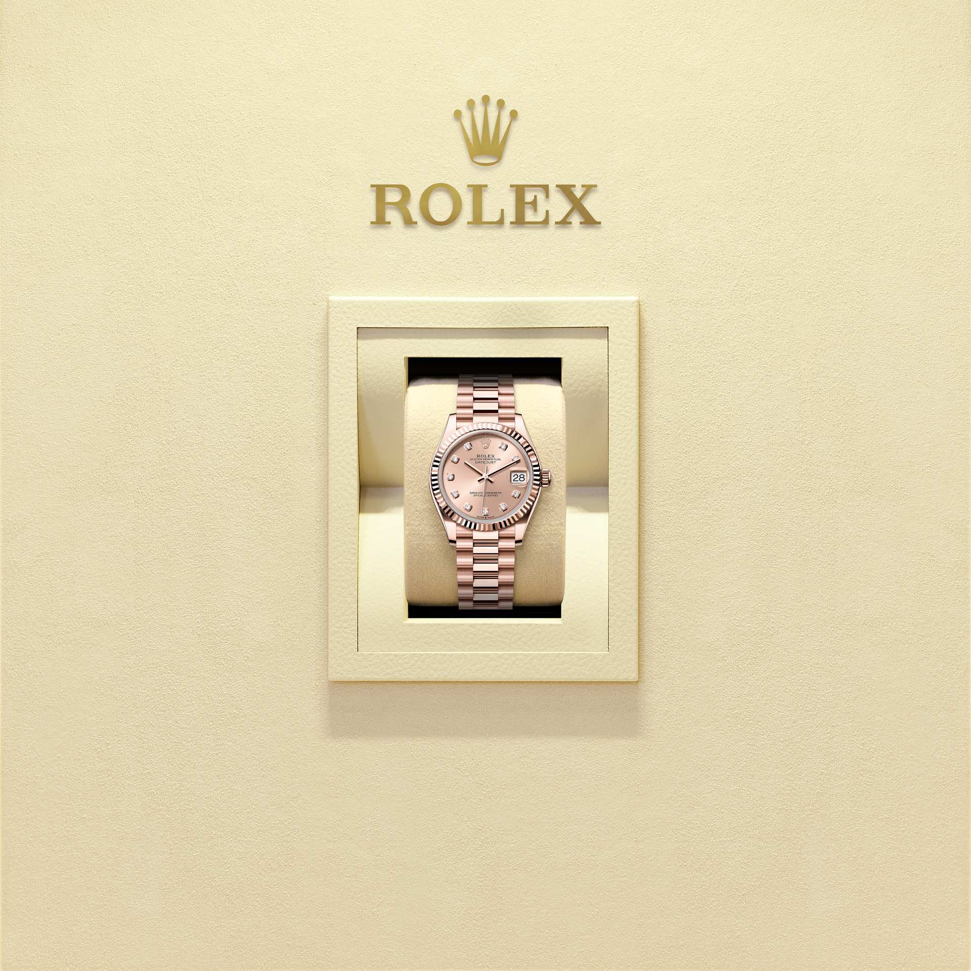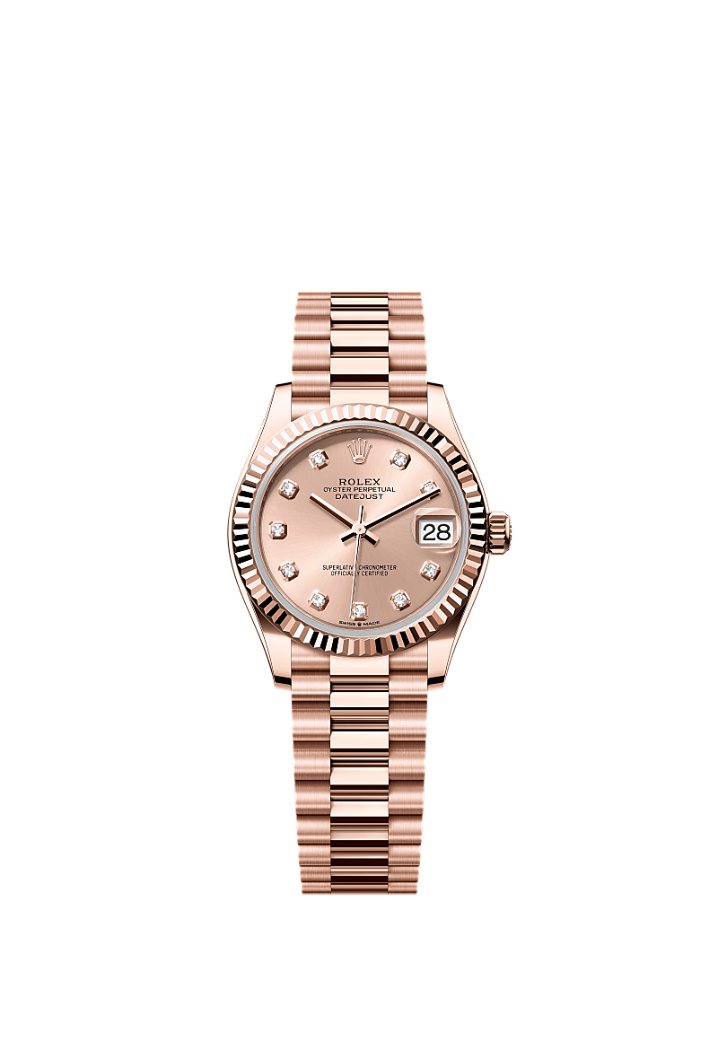 蚝式恒动日志型 31腕表18K永恒玫瑰金款,搭配镶钻玫瑰金色表盘及元首型(President)表带。