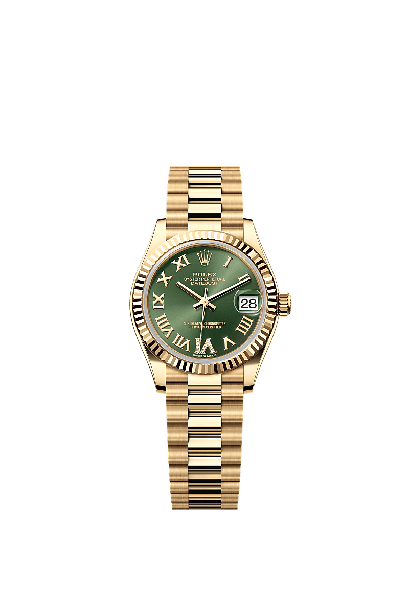 蚝式恒动日志型 31腕表18K黄金款,搭配镶钻橄榄绿色表盘及元首型(President)表带。