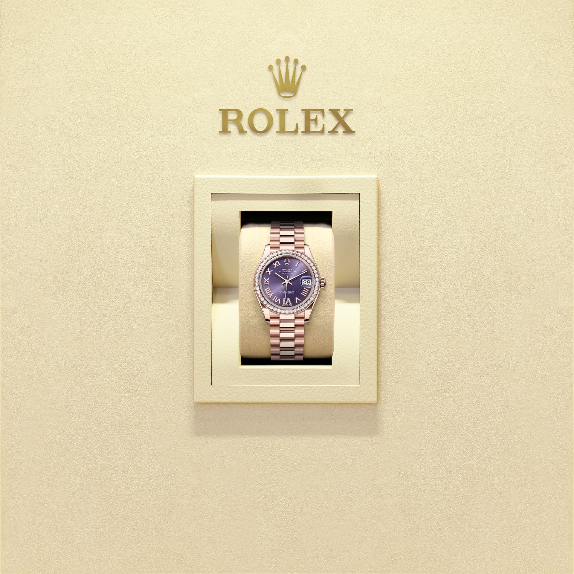 蚝式恒动日志型 31腕表18K永恒玫瑰金款,搭配镶钻茄紫色表盘及元首型(President)表带。