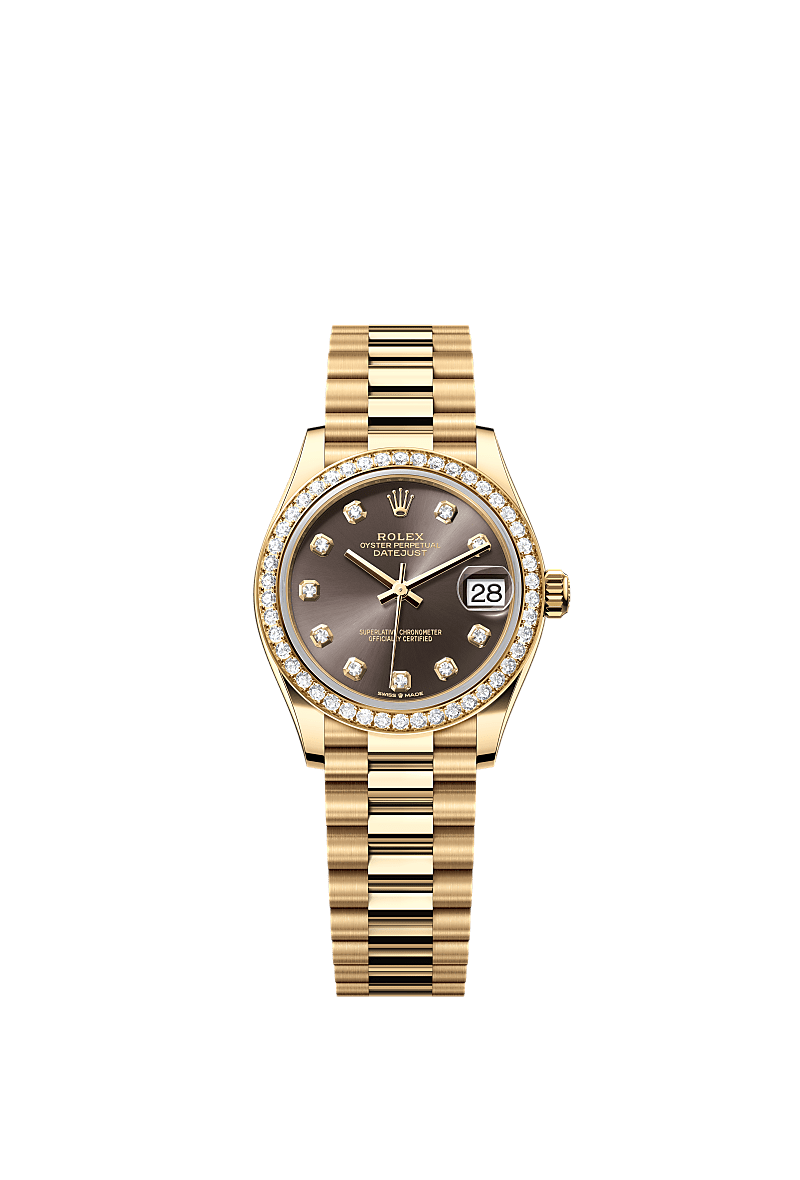 蚝式恒动日志型 31腕表18K黄金款,搭配镶钻深灰色表盘及元首型(President)表带。