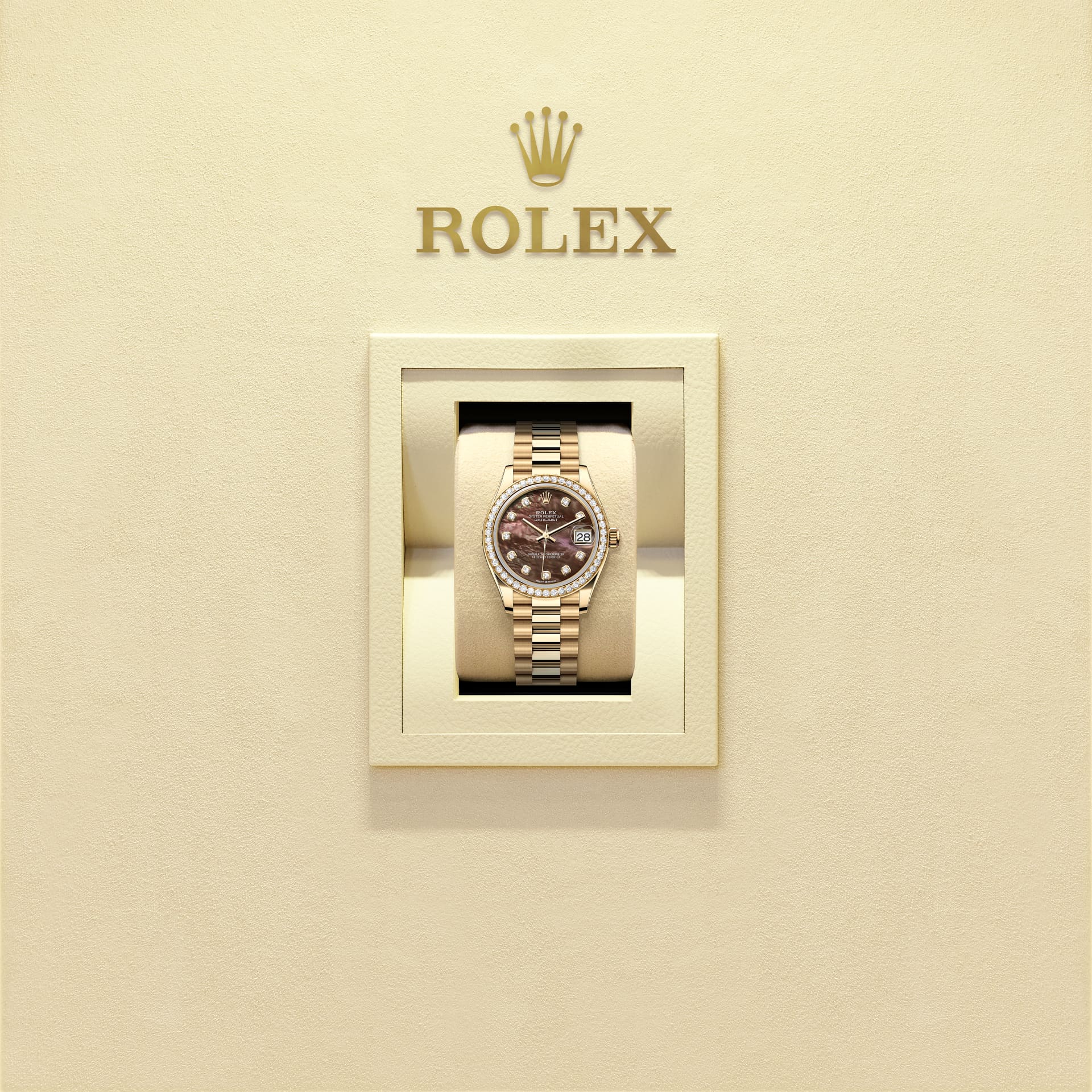 蚝式恒动日志型 31腕表18K黄金款,搭配镶钻黑色珍珠母表盘及元首型(President)表带。