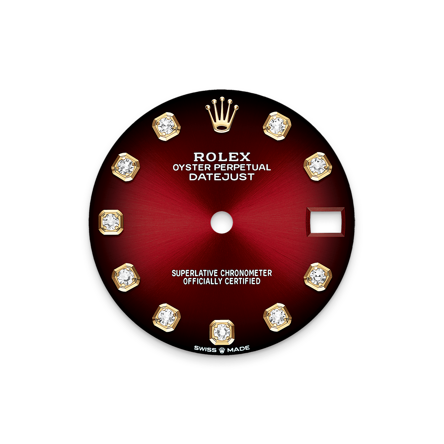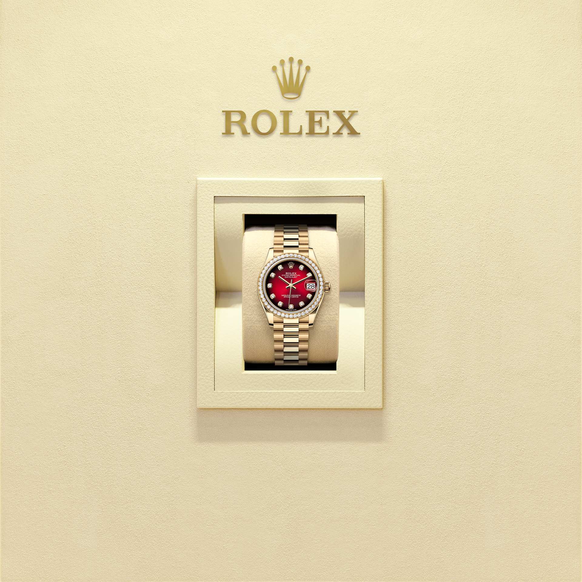 蚝式恒动日志型 31腕表18K黄金款,搭配渐变红色镶钻表盘及元首型(President)表带。