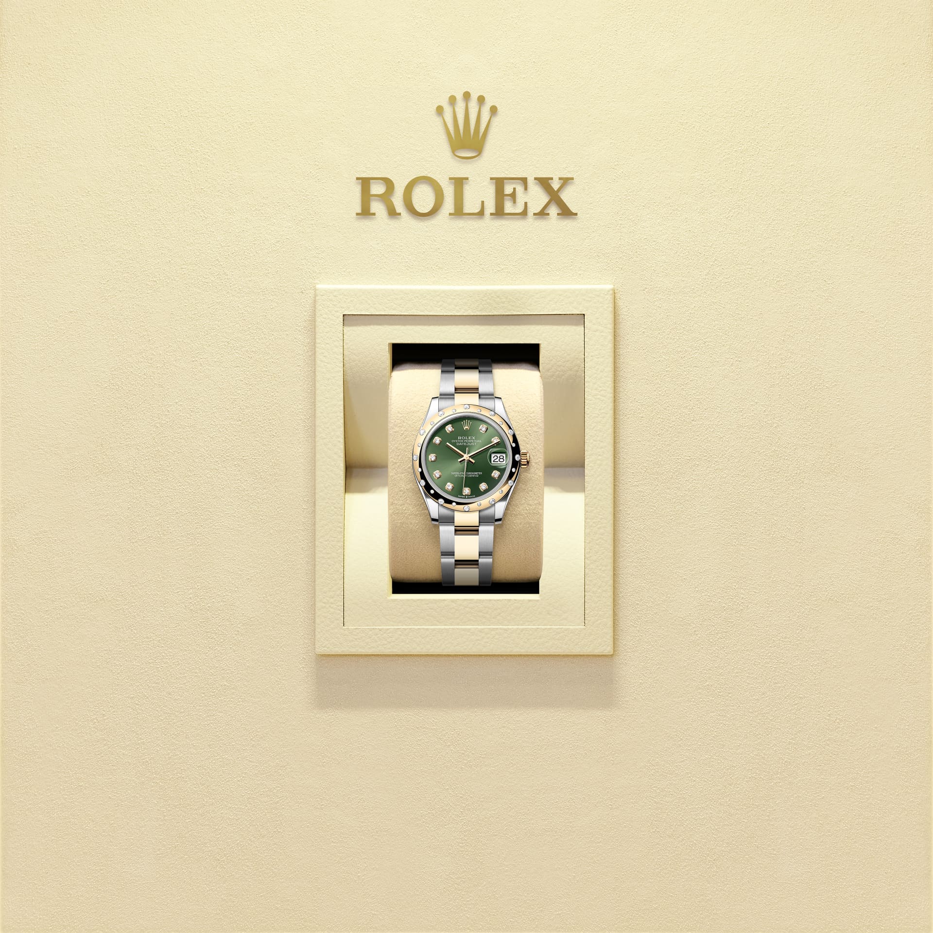 蚝式恒动日志型 31腕表黄金及蚝式钢款,搭配镶钻橄榄绿色表盘及蚝式(Oyster)表带。