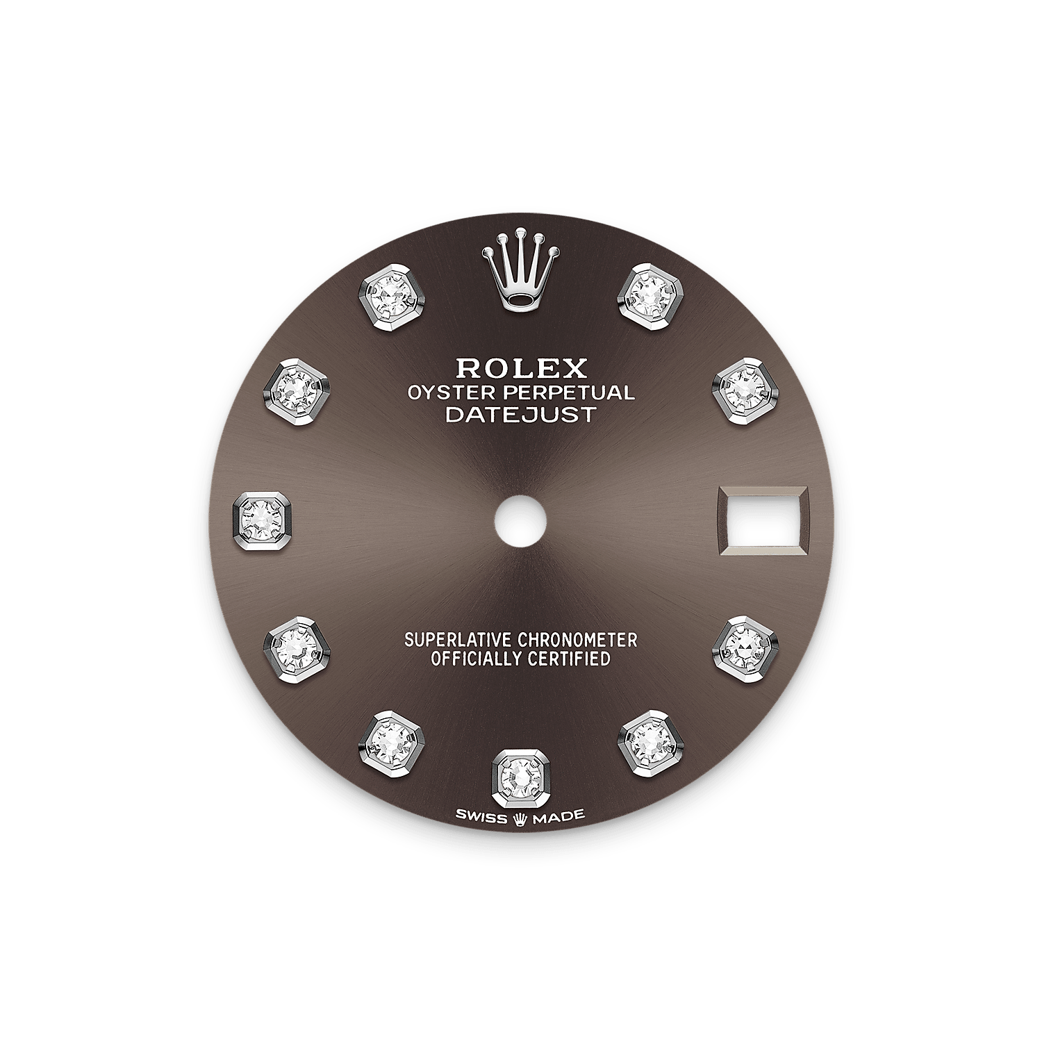 表盘设有18K金底座镶托钻石。蚝式系列的许多表盘款式均采用太阳光线效果,折射出淡雅光泽。这种效果需要超卓的刷光技术,打造从表盘中央往外扩展的刻纹。