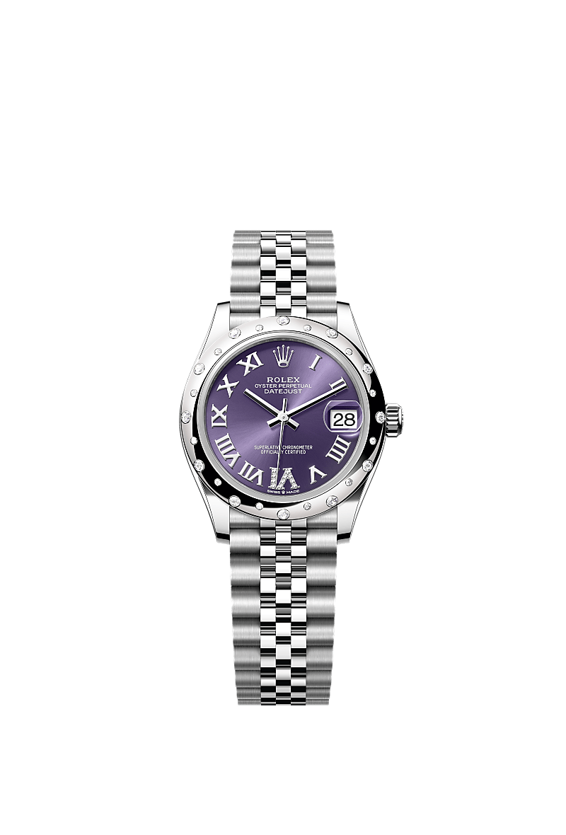 蚝式恒动日志型 31腕表白色黄金及蚝式钢款,搭配镶钻茄紫色表盘及纪念型(Jubilee)表带。