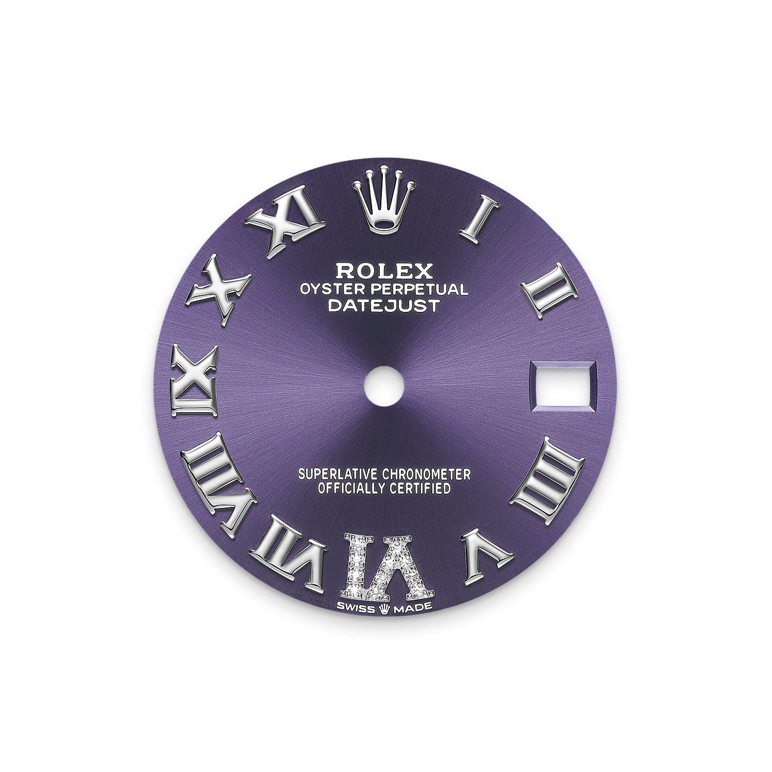 表盘设有镶11颗钻石的特大罗马数字VI。蚝式系列的许多表盘款式均采用太阳光线效果,折射出淡雅光泽。这种效果需要超卓的刷光技术,打造从表盘中央往外扩展的刻纹。