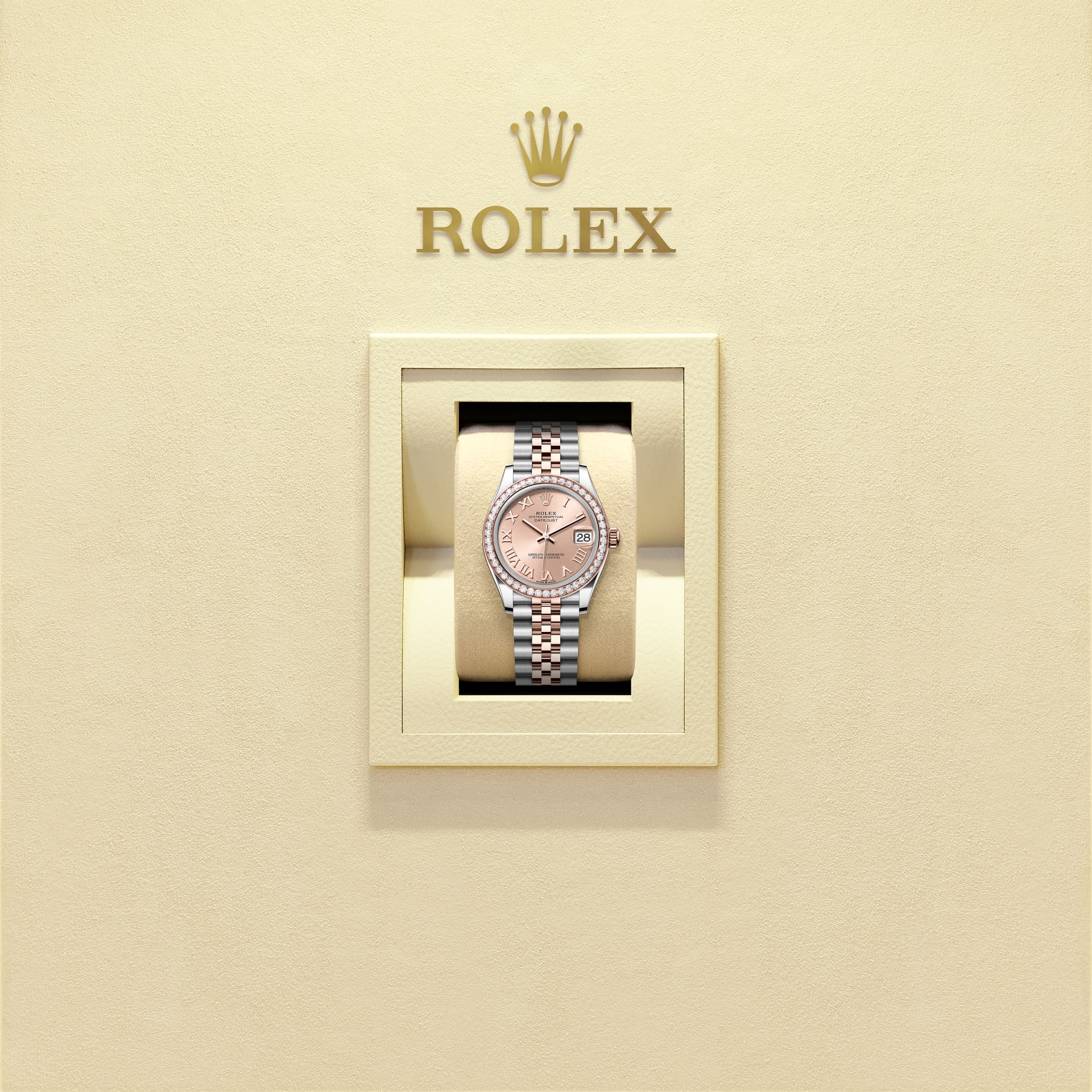 蚝式恒动日志型 31腕表永恒玫瑰金及蚝式钢款,搭配玫瑰金色表盘及纪念型(Jubilee)表带。