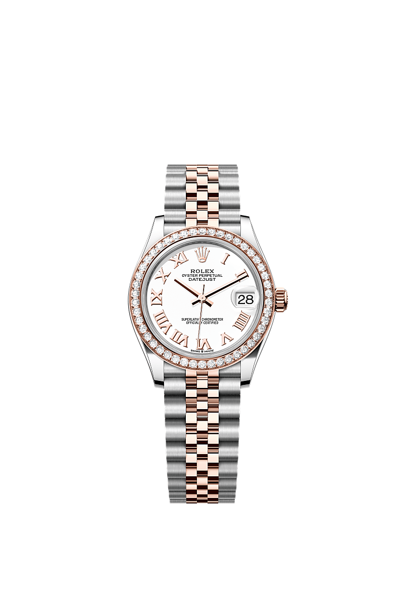 蚝式恒动日志型 31腕表永恒玫瑰金及蚝式钢款,搭配白色表盘及纪念型(Jubilee)表带。