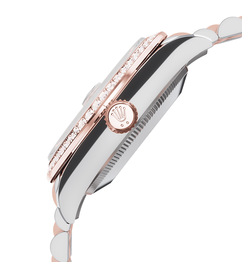 蚝式恒动日志型 31腕表永恒玫瑰金及蚝式钢款,搭配镶钻玫瑰金色表盘及纪念型(Jubilee)表带。