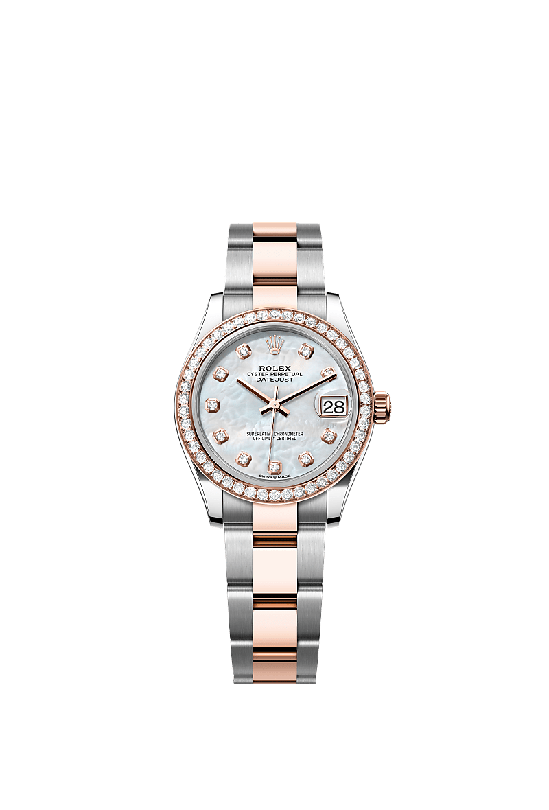 蚝式恒动日志型 31腕表永恒玫瑰金及蚝式钢款,搭配镶钻白色珍珠母表盘及蚝式(Oyster)表带。