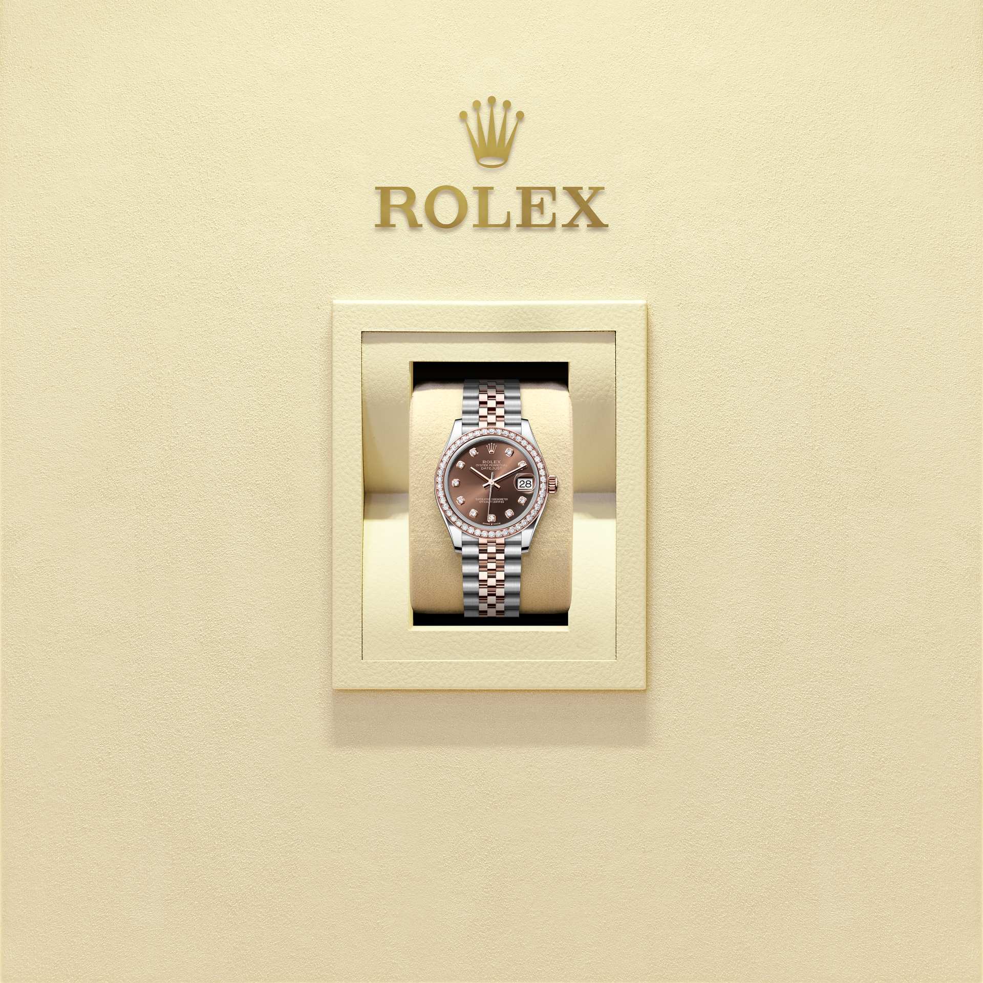 蚝式恒动日志型 31腕表永恒玫瑰金及蚝式钢款,搭配镶钻巧克力色表盘及纪念型(Jubilee)表带。