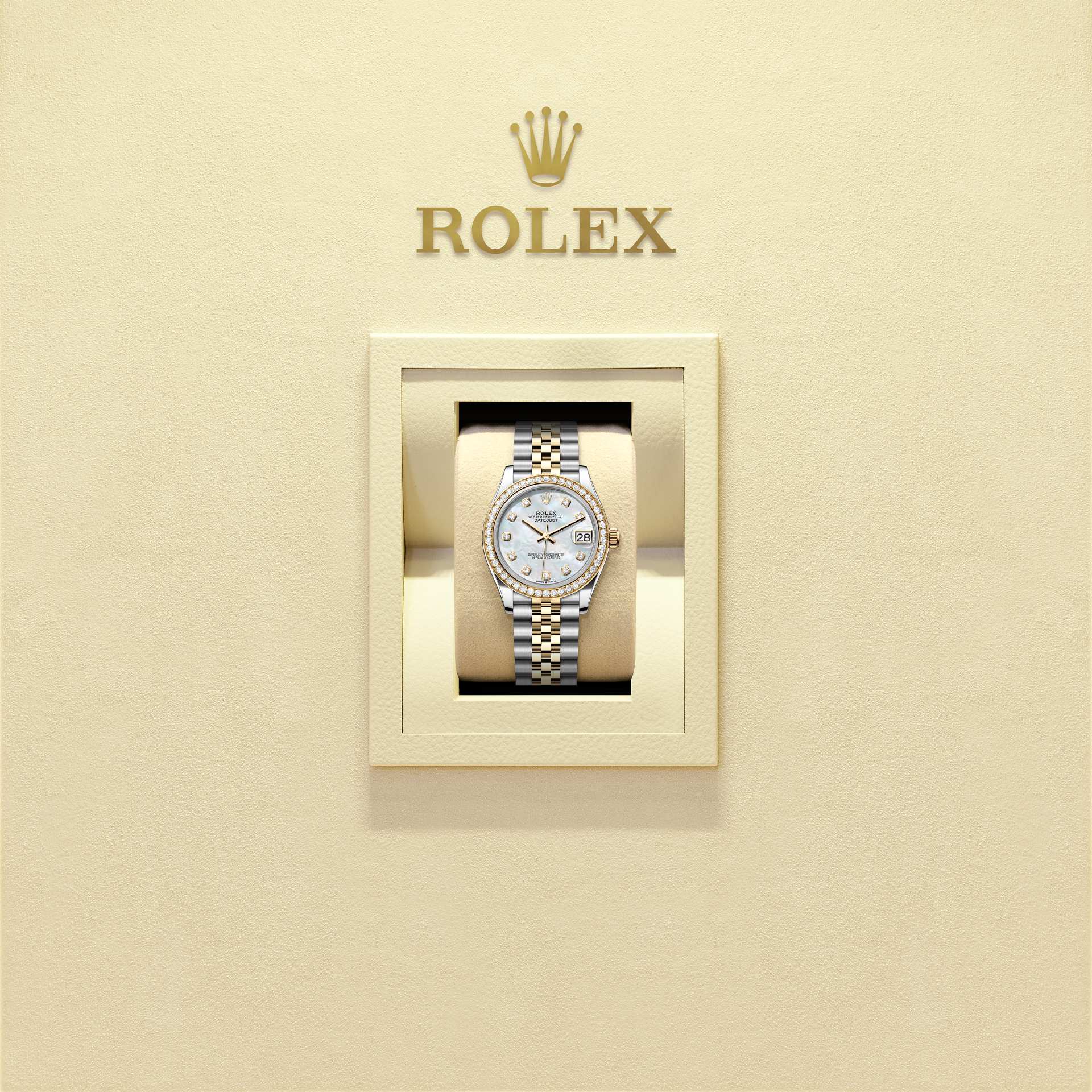 蚝式恒动日志型 31腕表黄金及蚝式钢款,搭配镶钻白色珍珠母表盘及纪念型(Jubilee)表带。