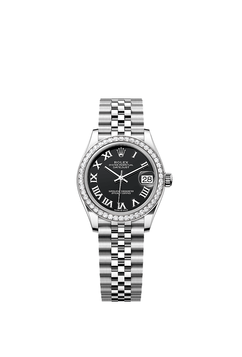 蚝式恒动日志型 31腕表白色黄金及蚝式钢款,搭配亮黑色表盘及纪念型(Jubilee)表带。