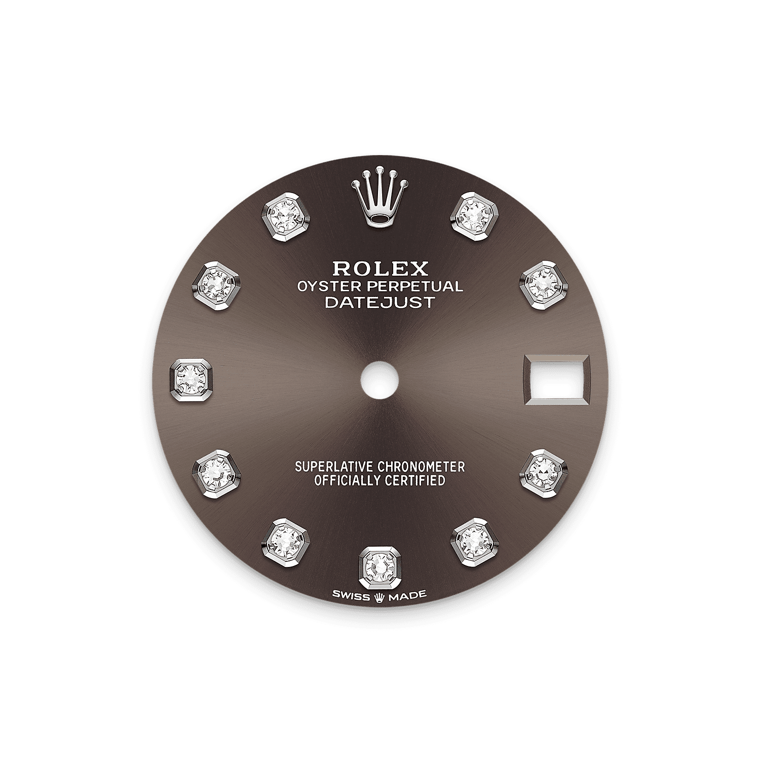 表盘设有18K金底座镶托钻石。蚝式系列的许多表盘款式均采用太阳光线效果,折射出淡雅光泽。这种效果需要超卓的刷光技术,打造从表盘中央往外扩展的刻纹。