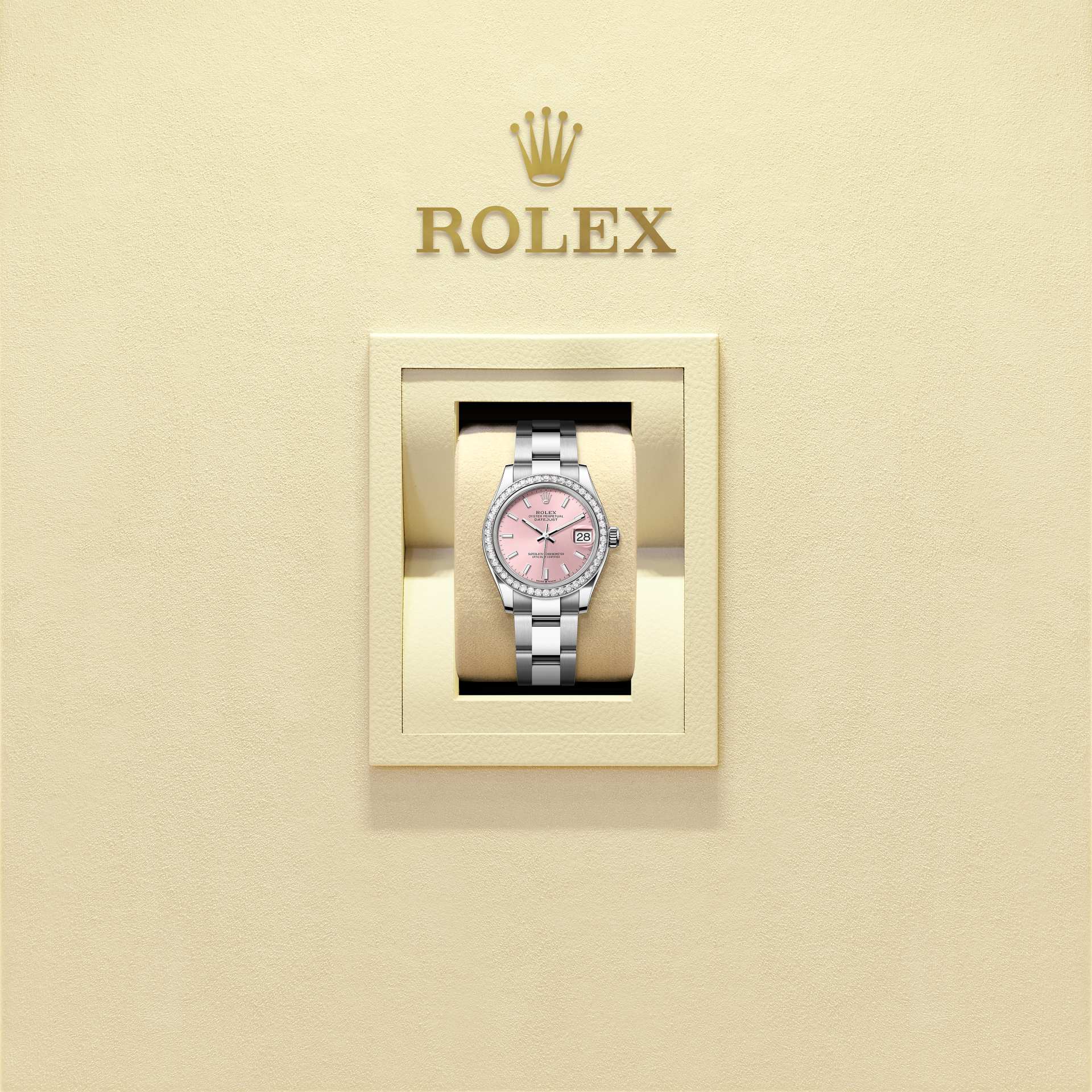 蚝式恒动日志型 31腕表白色黄金及蚝式钢款,搭配粉红色表盘及蚝式(Oyster)表带。