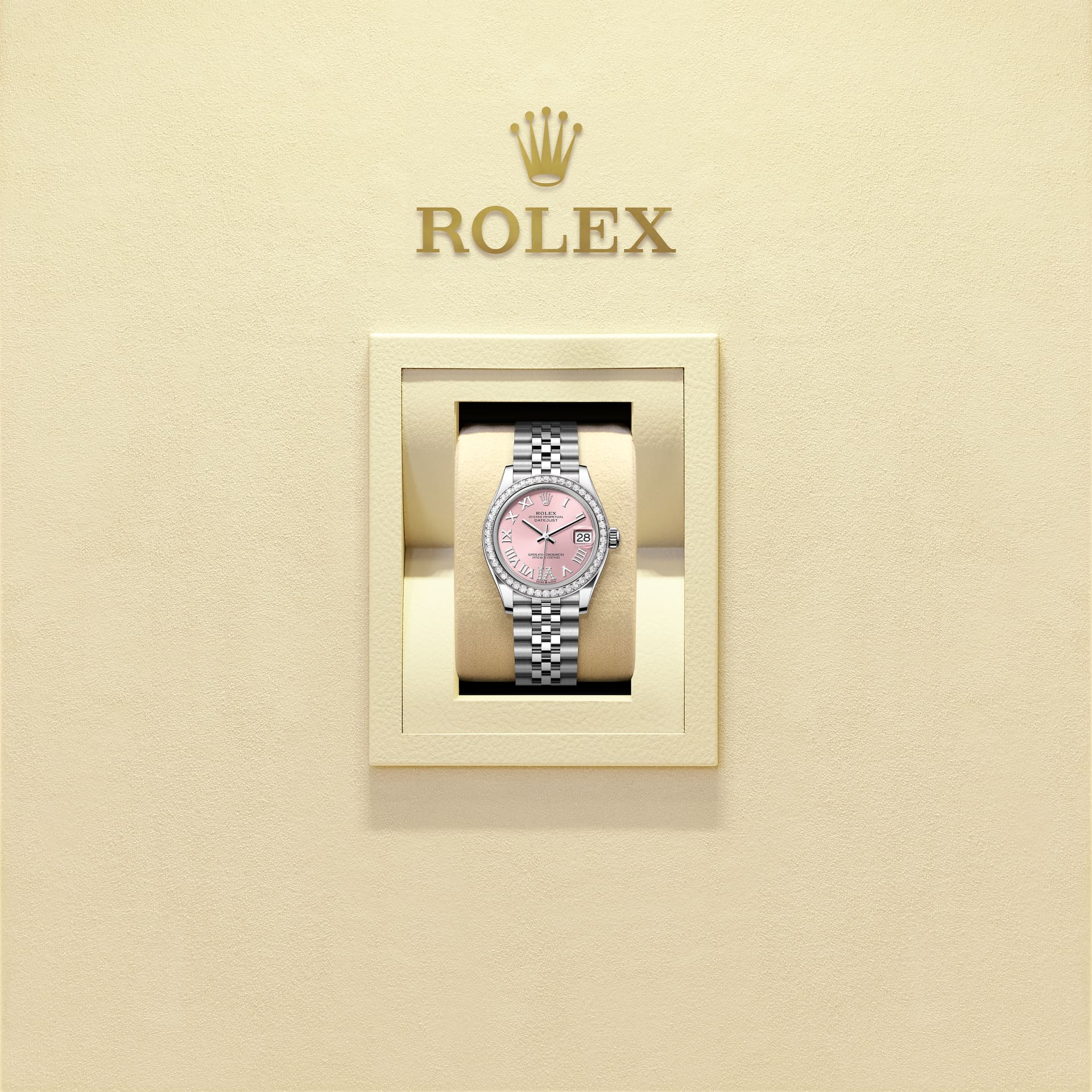 蚝式恒动日志型 31腕表白色黄金及蚝式钢款,搭配镶钻粉红色表盘及纪念型(Jubilee)表带。