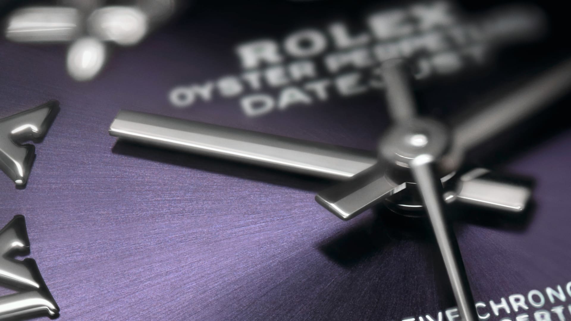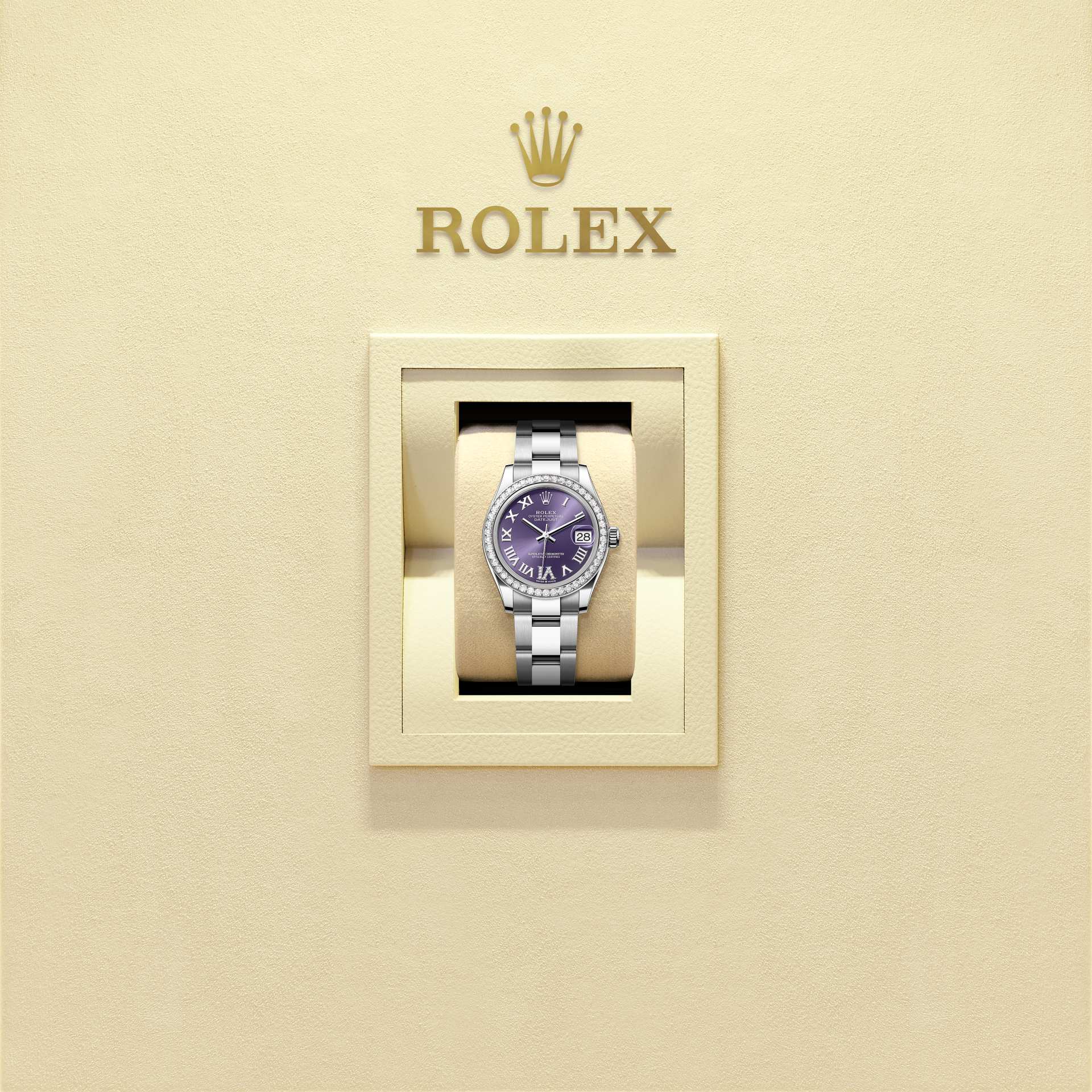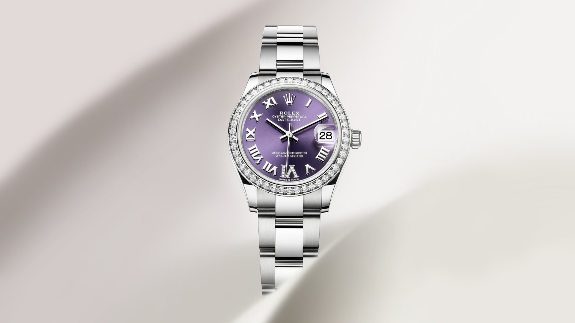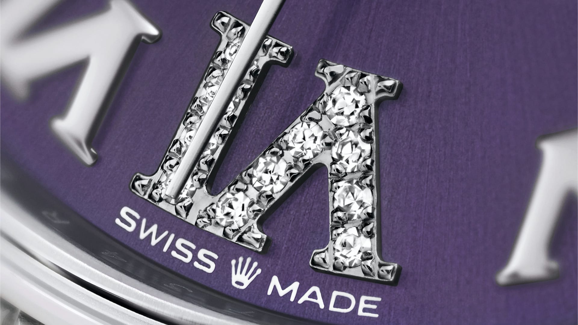 表盘设有镶11颗钻石的特大罗马数字VI。蚝式系列的许多表盘款式均采用太阳光线效果,折射出淡雅光泽。这种效果需要超卓的刷光技术,打造从表盘中央往外扩展的刻纹。