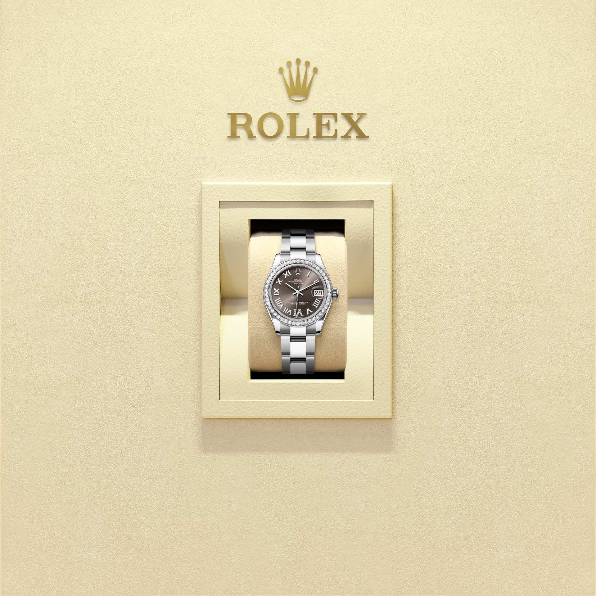 表盘设有镶11颗钻石的特大罗马数字VI。蚝式恒动系列的许多表盘款式均采用太阳光线效果,折射出淡雅光泽。这种效果需要超卓的刷光技术,打造从表盘中央往外扩展的刻纹。